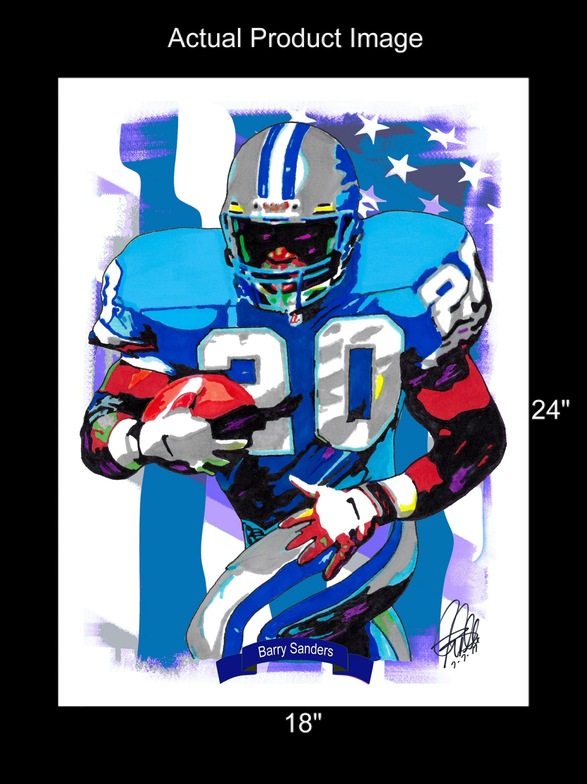 Print from Original Ink Drawing of Barry Sanders of the Detroit Lions. Printed on 18"x24" Premium Gloss High Quality Photo Paper. Print is great for matting and display – Signed & Dated by Artist on front of print - comes with Certificate of Authenticity with Your Name - will be shipped inside 3 x 30" 2 Mil Industrial Poly Bag & 2" x 19" Kraft Mailing Tubes with End Caps - .070: thick
