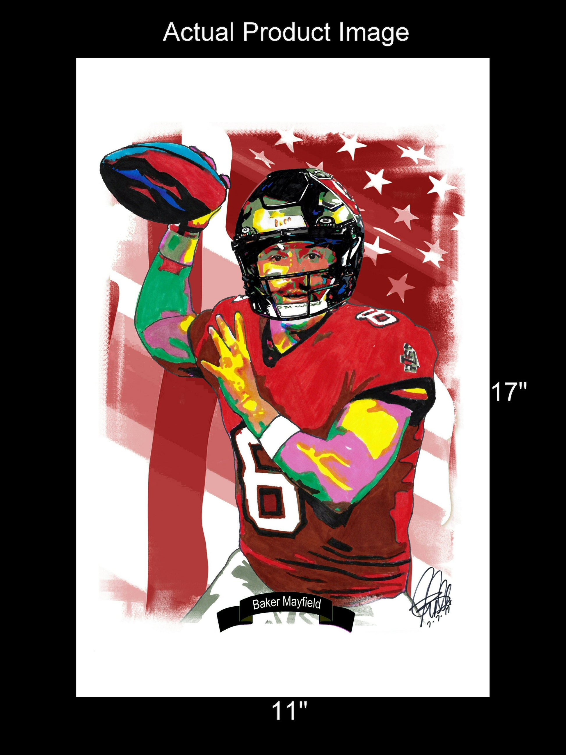 Print from Original Ink Drawing of Baker Mayfield of the Tampa Bay Buccaneers. Printed on 11"x17" Premium Gloss High Quality Photo Paper. Print is great for matting and display – Signed & Dated by Artist on front of print - comes with Certificate of Authenticity with Your Name - will be shipped inside 3 x 30" 2 Mil Industrial Poly Bag & 2" x 19" Kraft Mailing Tubes with End Caps - .070: thick.