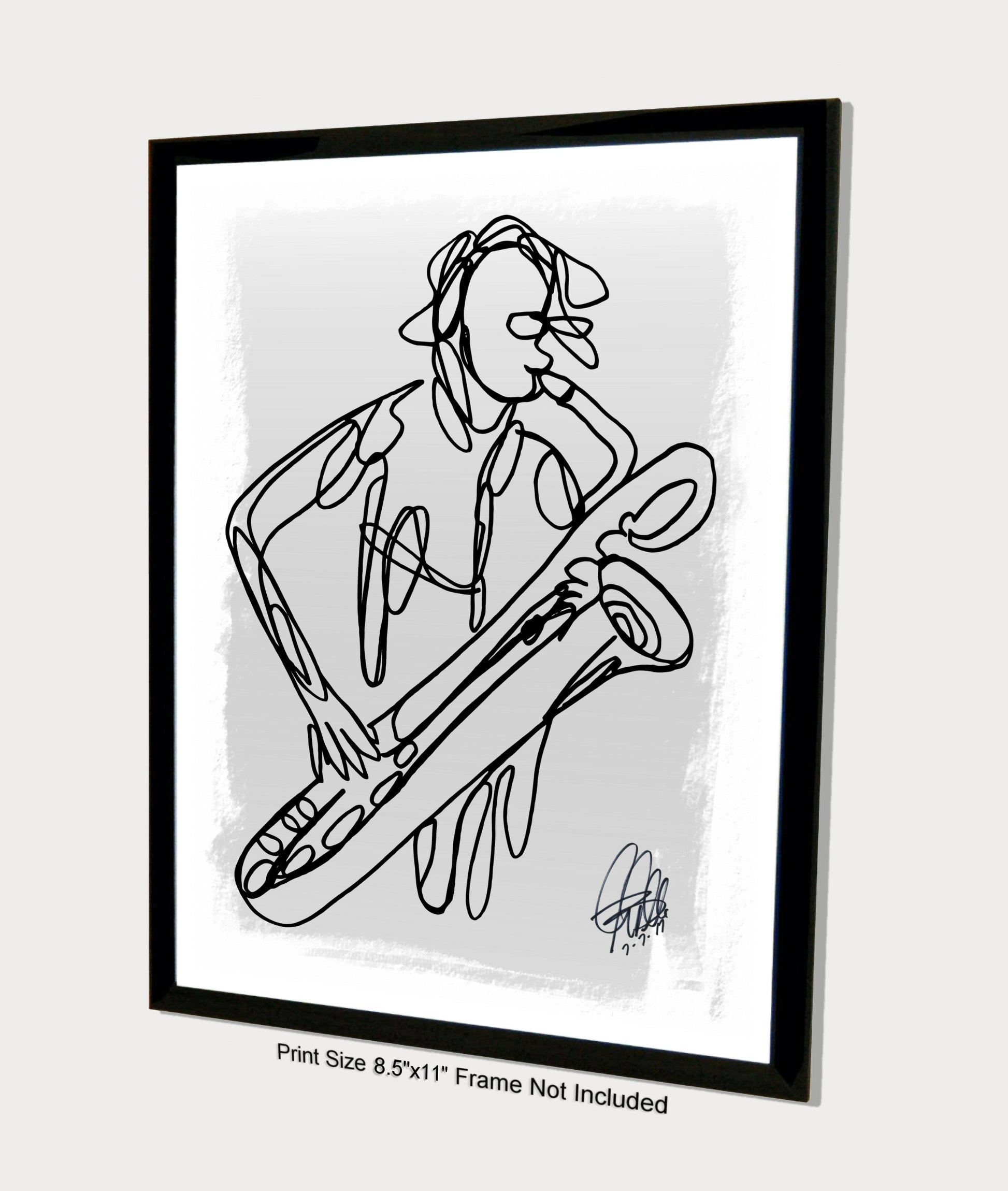 Print from Original Ink Drawing of Baritone Sax Player. Printed on 8.5"x11" Premium Gloss High Quality Photo Paper. Print is great for matting and display – Signed & Dated by Artist on front of print - comes with Certificate of Authenticity with Your Name - will be shipped inside 12"x12"x1" sturdy container.