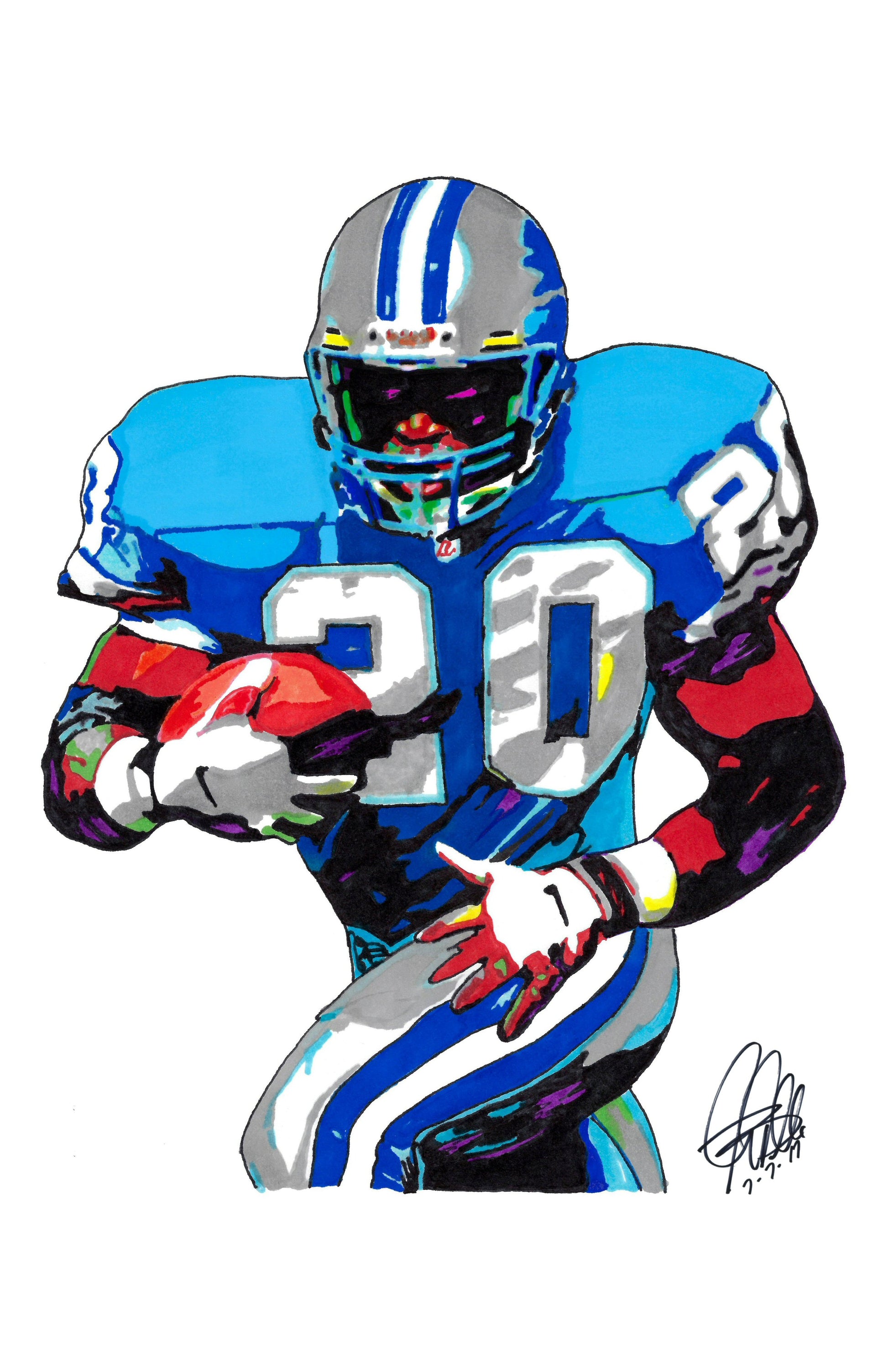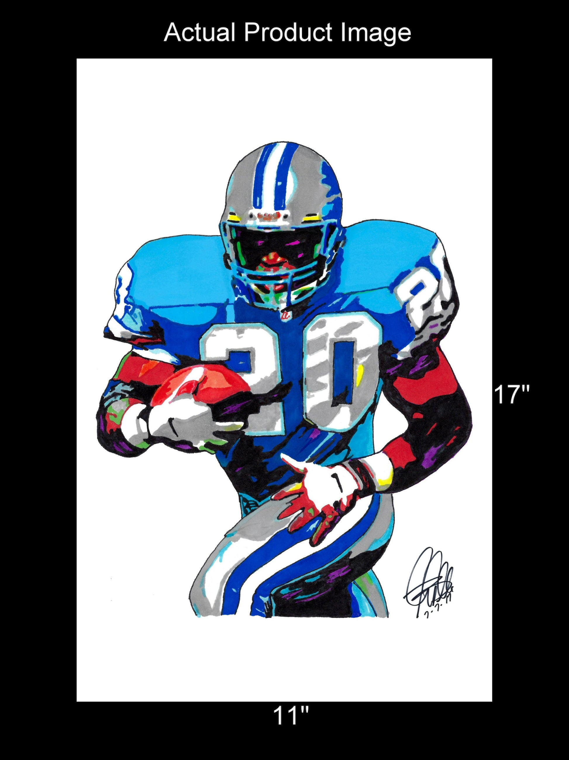 Print from Original Ink Drawing of Barry Sanders of the Detroit Lions. Printed on 11"x17" Premium Gloss High Quality Photo Paper. Print is great for matting and display – Signed & Dated by Artist on front of print - comes with Certificate of Authenticity with Your Name - will be shipped inside 3 x 30" 2 Mil Industrial Poly Bag & 2" x 19" Kraft Mailing Tubes with End Caps - .070: thick.