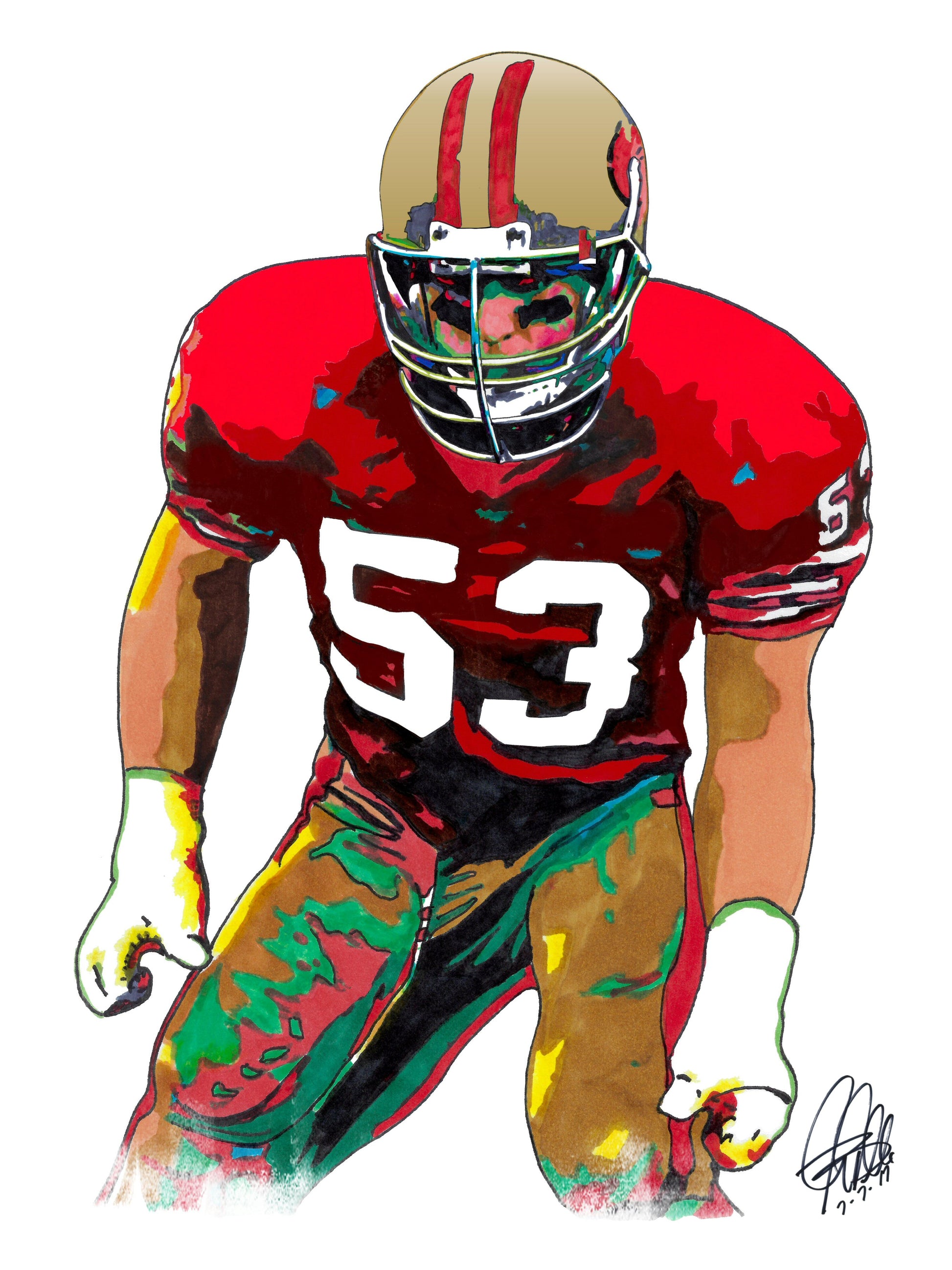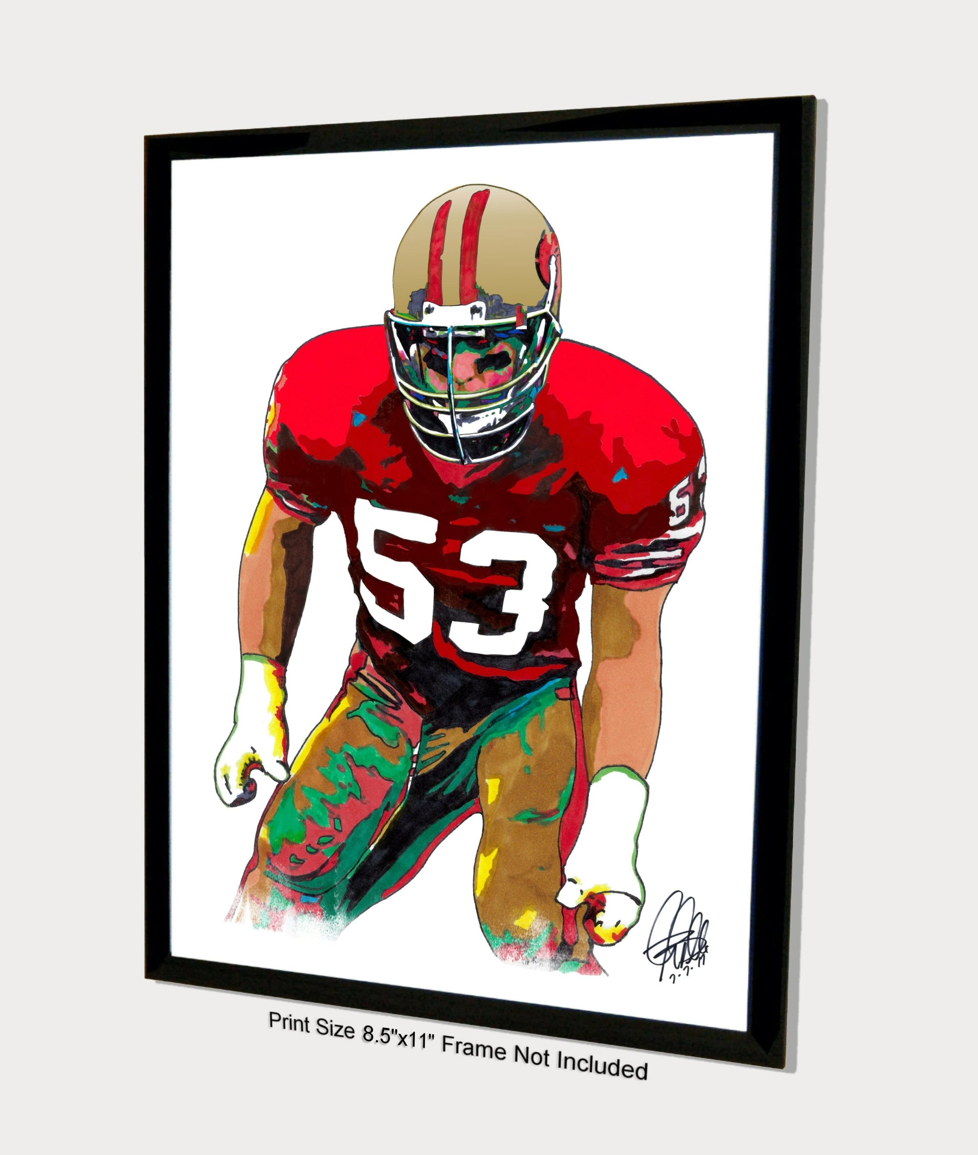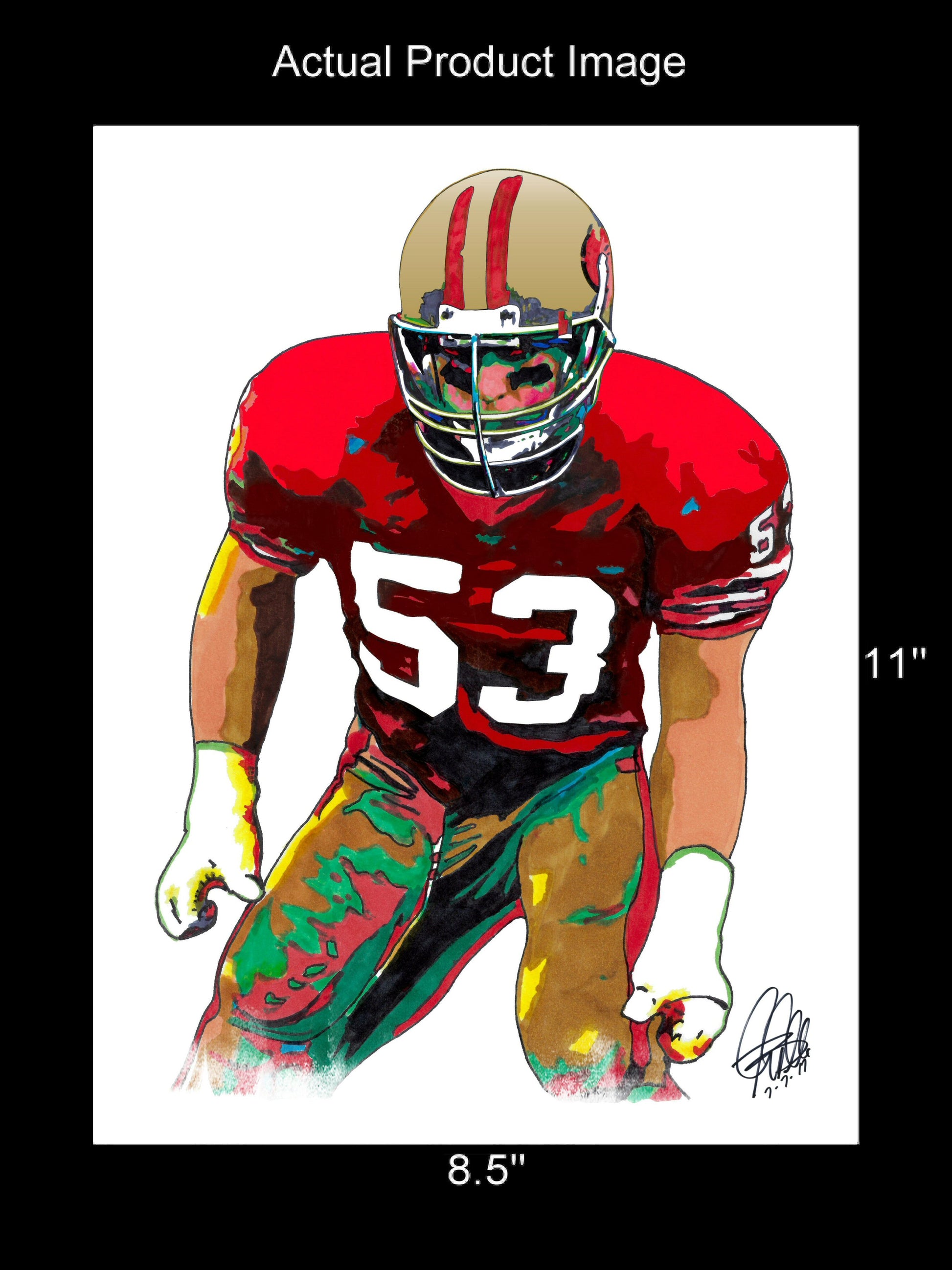 Print from Original Ink Drawing of Bill Romanowski of the San Francisco 49ers. Printed on 8.5"x11" Premium Gloss High Quality Photo Paper. Print is great for matting and display – Signed & Dated by Artist on front of print - comes with Certificate of Authenticity with Your Name - will be shipped inside 12"x12"x1" sturdy container.