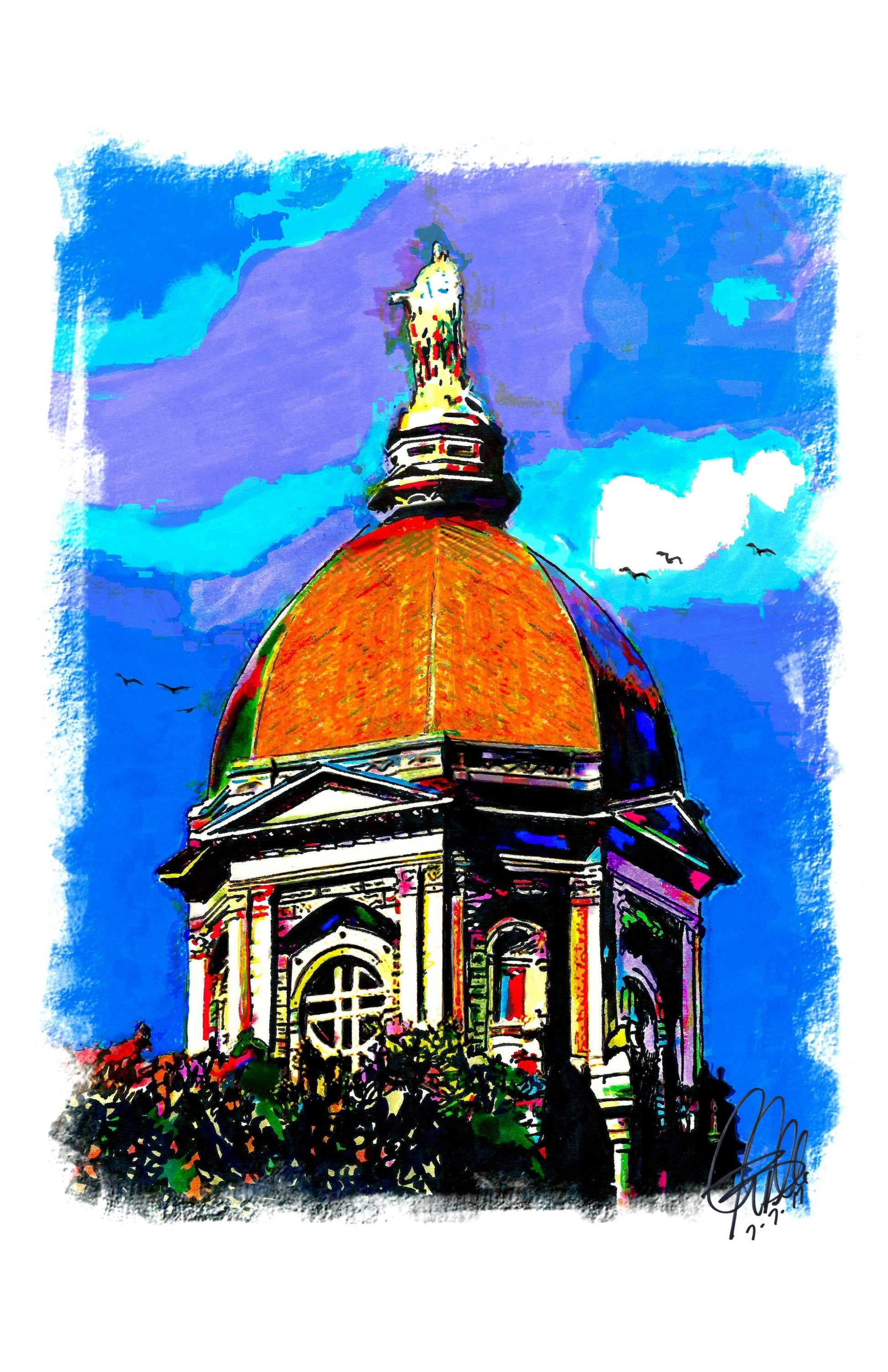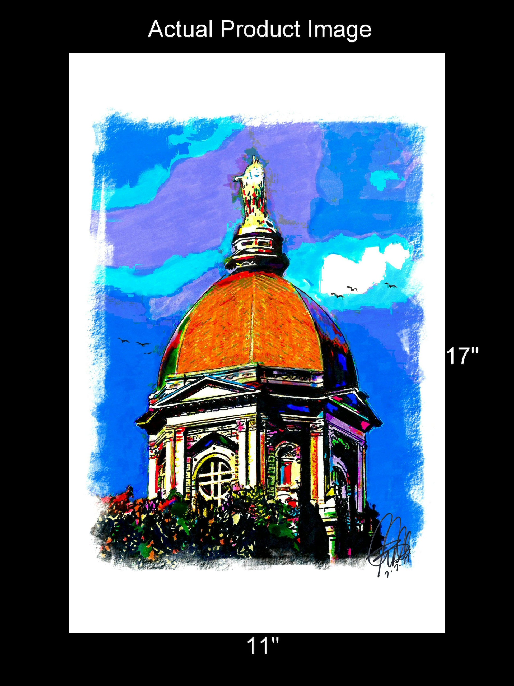Print from Original Ink Drawing of University of Notre Dame Dome. Printed on 11"x17" Premium Gloss High Quality Photo Paper. Print is great for matting and display – Signed & Dated by Artist on front of print - comes with Certificate of Authenticity with Your Name - will be shipped inside 3 x 30" 2 Mil Industrial Poly Bag & 2" x 19" Kraft Mailing Tubes with End Caps - .070: thick