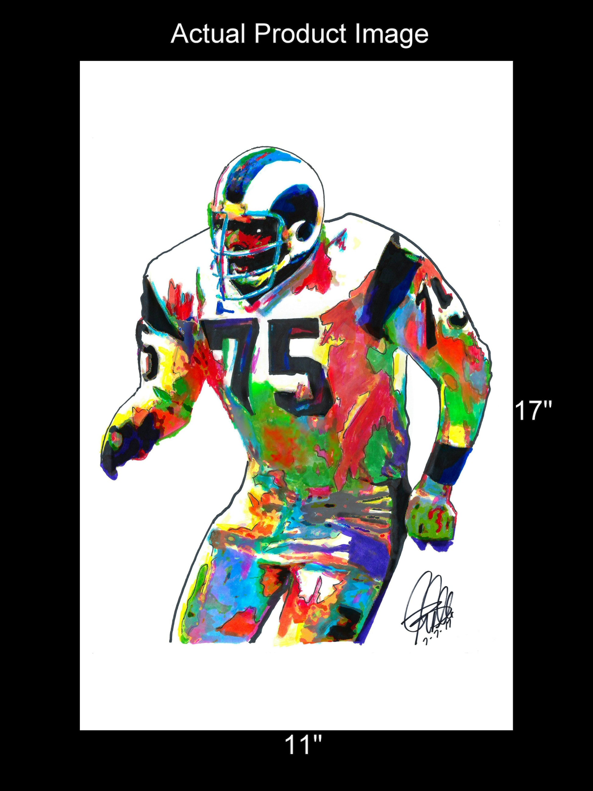 Print from Original Ink Drawing of Deacon Jones of the Los Angeles Rams. Printed on 11"x17" Premium Gloss High Quality Photo Paper. Print is great for matting and display – Signed & Dated by Artist on front of print - comes with Certificate of Authenticity with Your Name - will be shipped inside 3 x 30" 2 Mil Industrial Poly Bag & 2" x 19" Kraft Mailing Tubes with End Caps - .070: thick