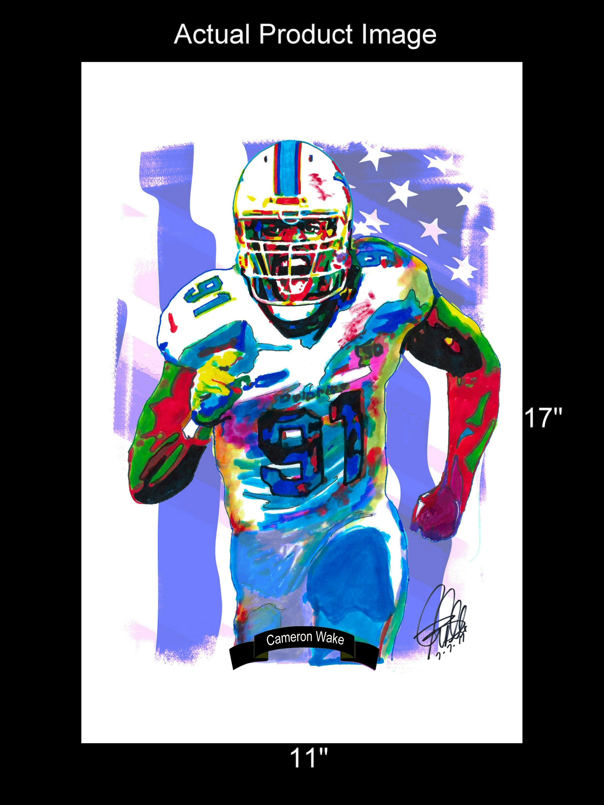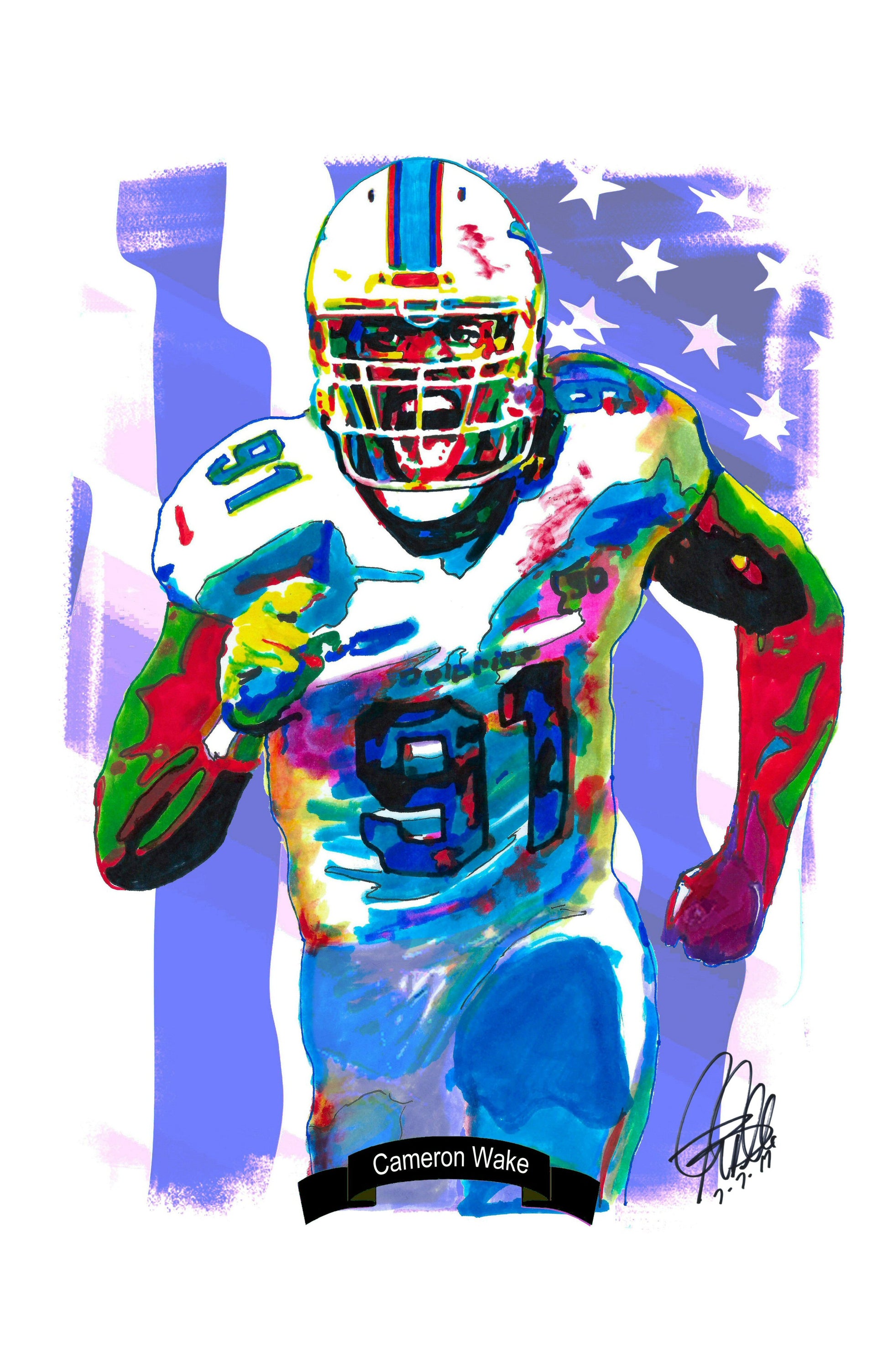 Print from Original Ink Drawing of Cameron Wake of the Miami Dolphins. Printed on 11"x17" Premium Gloss High Quality Photo Paper. Print is great for matting and display – Signed & Dated by Artist on front of print - comes with Certificate of Authenticity with Your Name - will be shipped inside 3 x 30" 2 Mil Industrial Poly Bag & 2" x 19" Kraft Mailing Tubes with End Caps - .070: thick