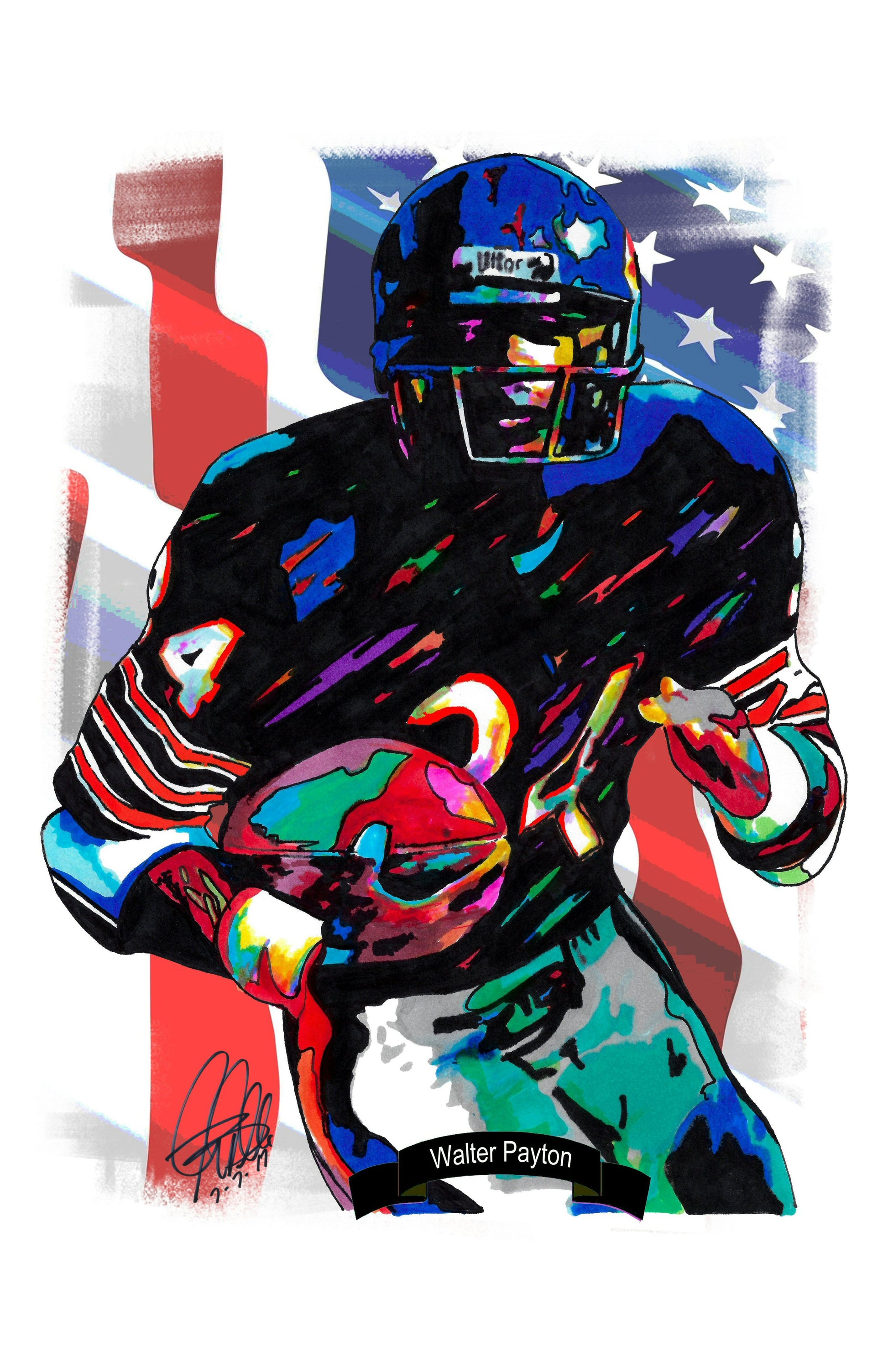 Print from Original Ink Drawing of Walter Payton of the Chicago Bears. Printed on 11"x17" Premium Gloss High Quality Photo Paper. Print is great for matting and display – Signed & Dated by Artist on front of print - comes with Certificate of Authenticity with Your Name - will be shipped inside 3 x 30" 2 Mil Industrial Poly Bag & 2" x 19" Kraft Mailing Tubes with End Caps - .070: thick