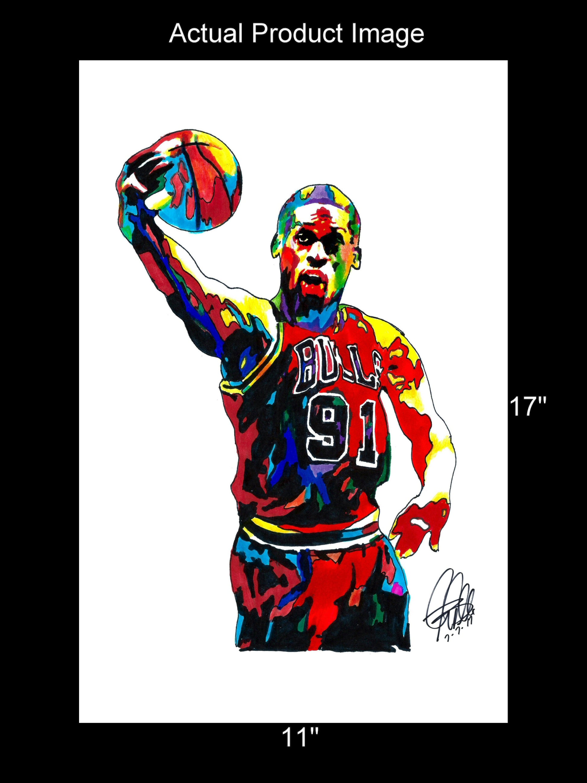 Print from Original Ink Drawing of Dennis Rodman of the Chicago Bulls. Printed on 11"x17" Premium Gloss High Quality Photo Paper. Print is great for matting and display – Signed & Dated by Artist on front of print - comes with Certificate of Authenticity with Your Name - will be shipped inside 3 x 30" 2 Mil Industrial Poly Bag & 2" x 19" Kraft Mailing Tubes with End Caps - .070: thick