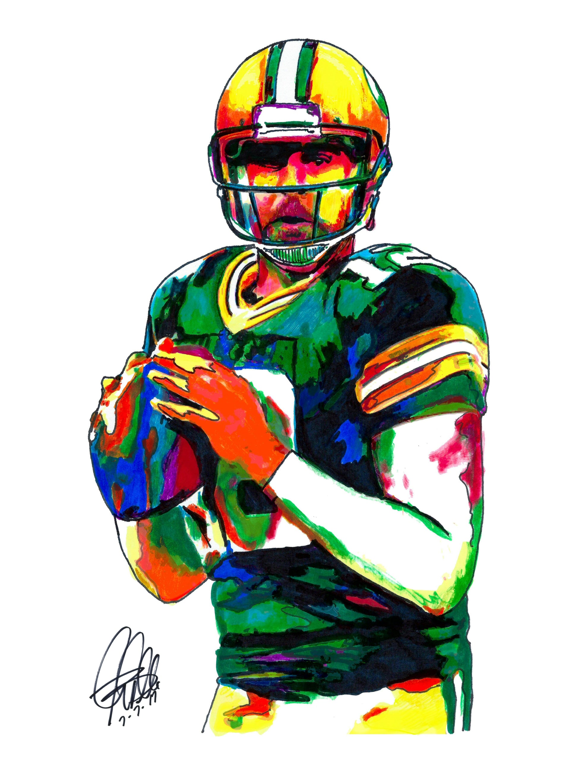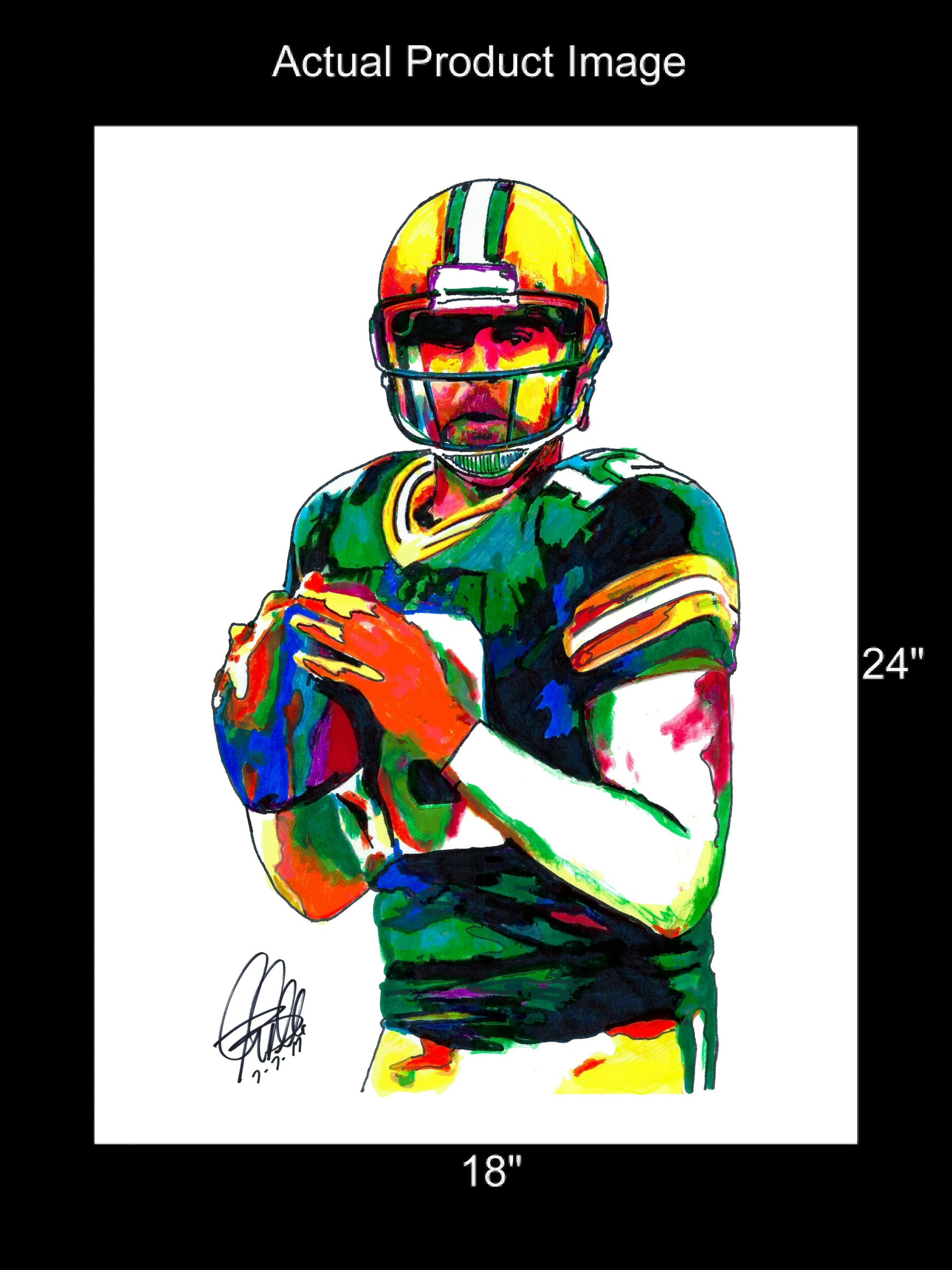 Print from Original Ink Drawing of Aaron Rodgers of the Green Bay Packers. Printed on 18"x24" Premium Gloss High Quality Photo Paper. Print is great for matting and display – Signed & Dated by Artist on front of print - comes with Certificate of Authenticity with Your Name - will be shipped inside 3 x 30" 2 Mil Industrial Poly Bag & 2" x 19" Kraft Mailing Tubes with End Caps - .070: thick