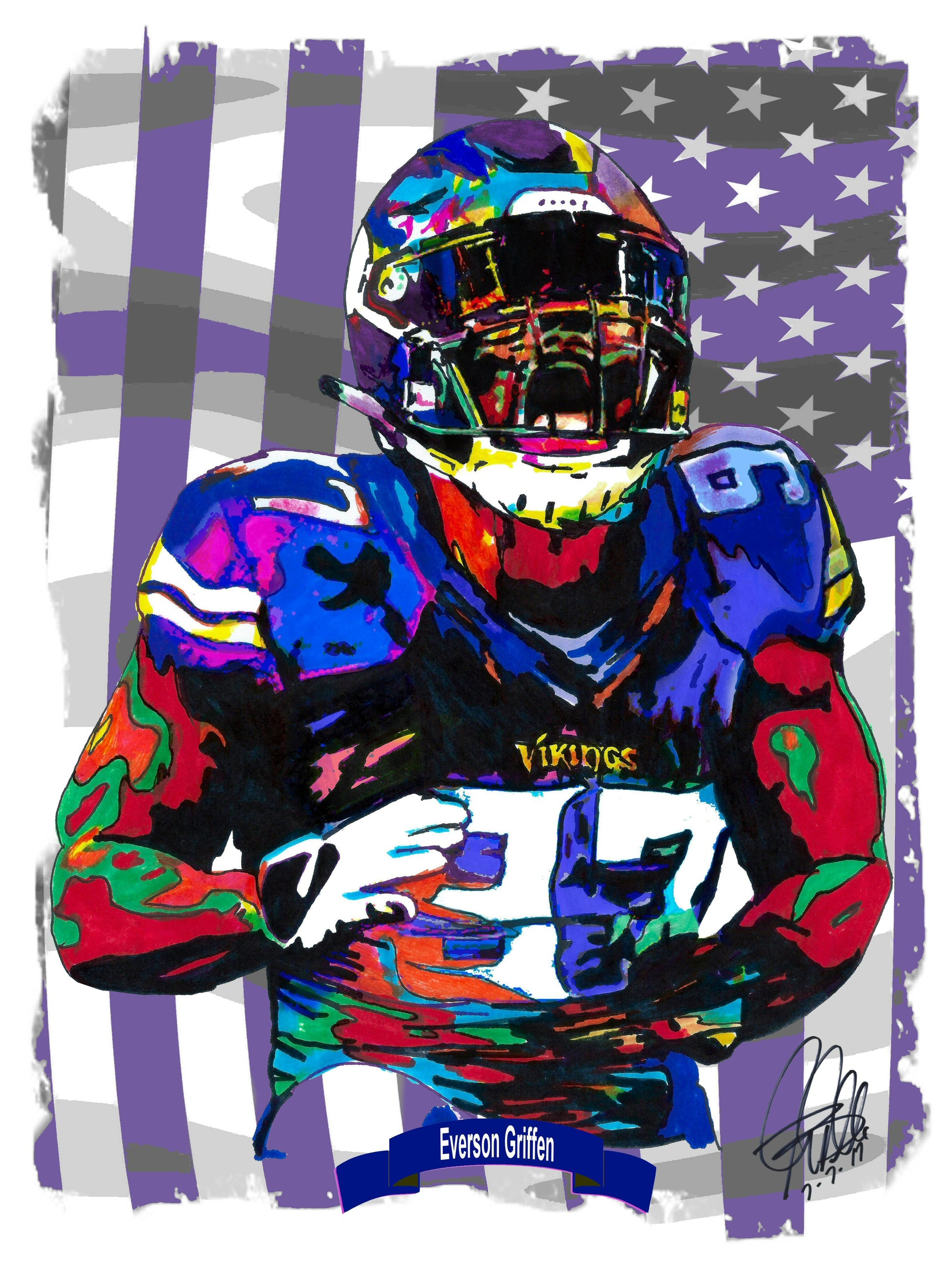 Print from Original Ink Drawing of Everson Griffen of the Minnesota Vikings. Printed on 18"x24" Premium Gloss High Quality Photo Paper. Print is great for matting and display – Signed & Dated by Artist on front of print - comes with Certificate of Authenticity with Your Name - will be shipped inside 3 x 30" 2 Mil Industrial Poly Bag & 2" x 19" Kraft Mailing Tubes with End Caps - .070: thick