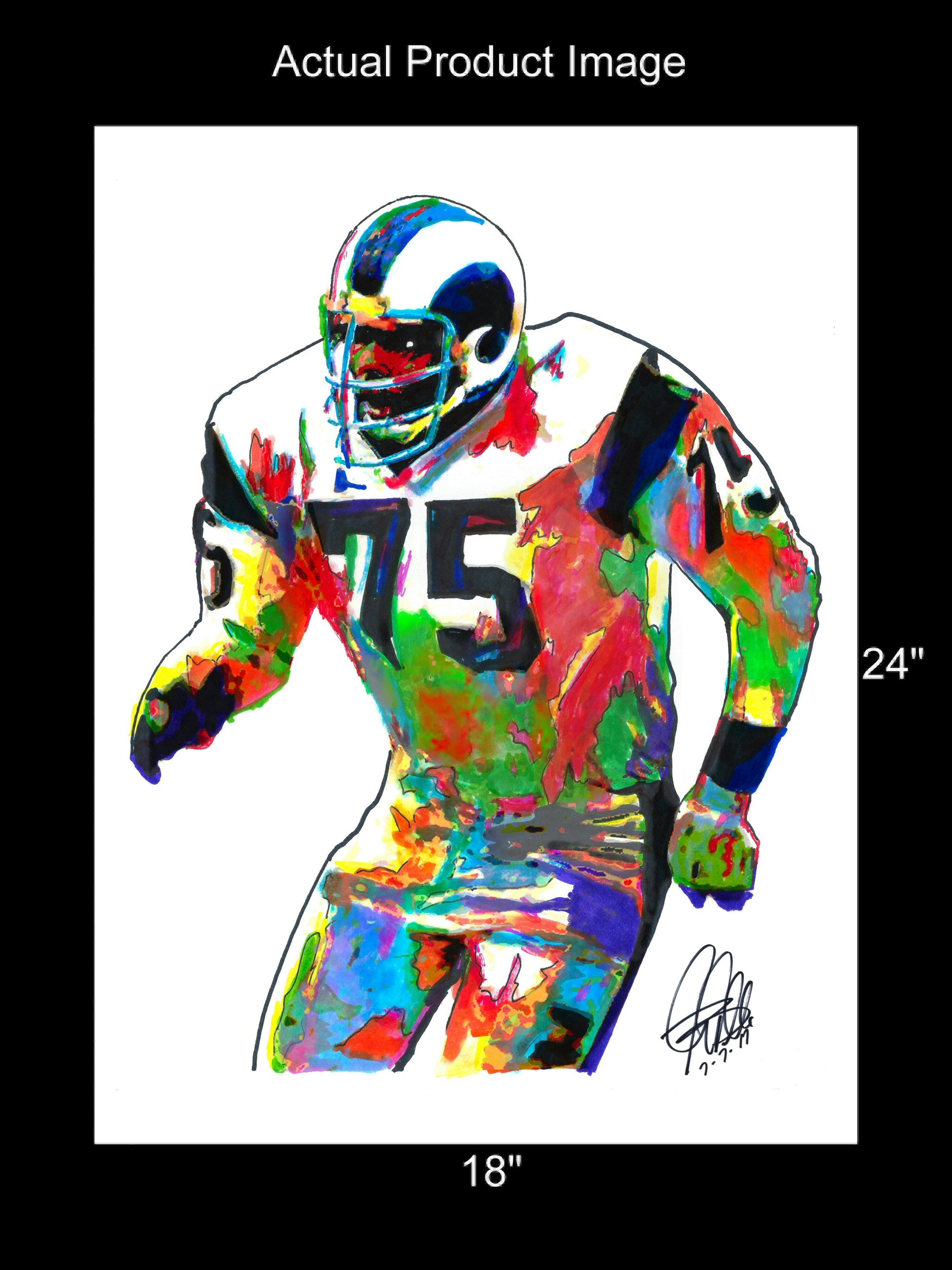 Print from Original Ink Drawing of Deacon Jones of the Los Angeles Rams. Printed on 18"x24" Premium Gloss High Quality Photo Paper. Print is great for matting and display – Signed & Dated by Artist on front of print - comes with Certificate of Authenticity with Your Name - will be shipped inside 3 x 30" 2 Mil Industrial Poly Bag & 2" x 19" Kraft Mailing Tubes with End Caps - .070: thick
