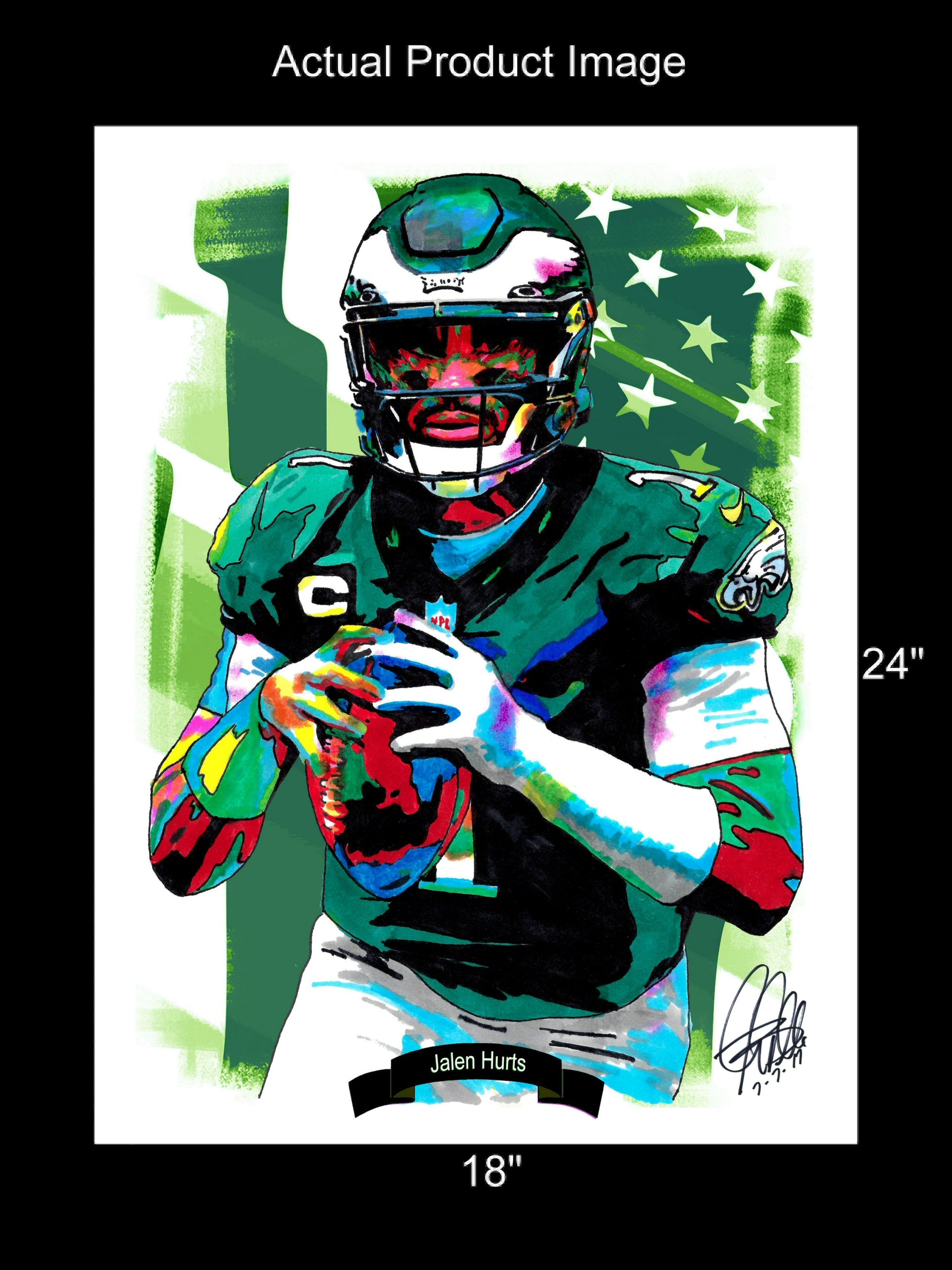 Print from Original Ink Drawing of Jalen Hurts of the Philadelphia Eagles. Printed on 18"x24" Premium Gloss High Quality Photo Paper. Print is great for matting and display – Signed & Dated by Artist on front of print - comes with Certificate of Authenticity with Your Name - will be shipped inside 3 x 30" 2 Mil Industrial Poly Bag & 2" x 19" Kraft Mailing Tubes with End Caps - .070: thick
