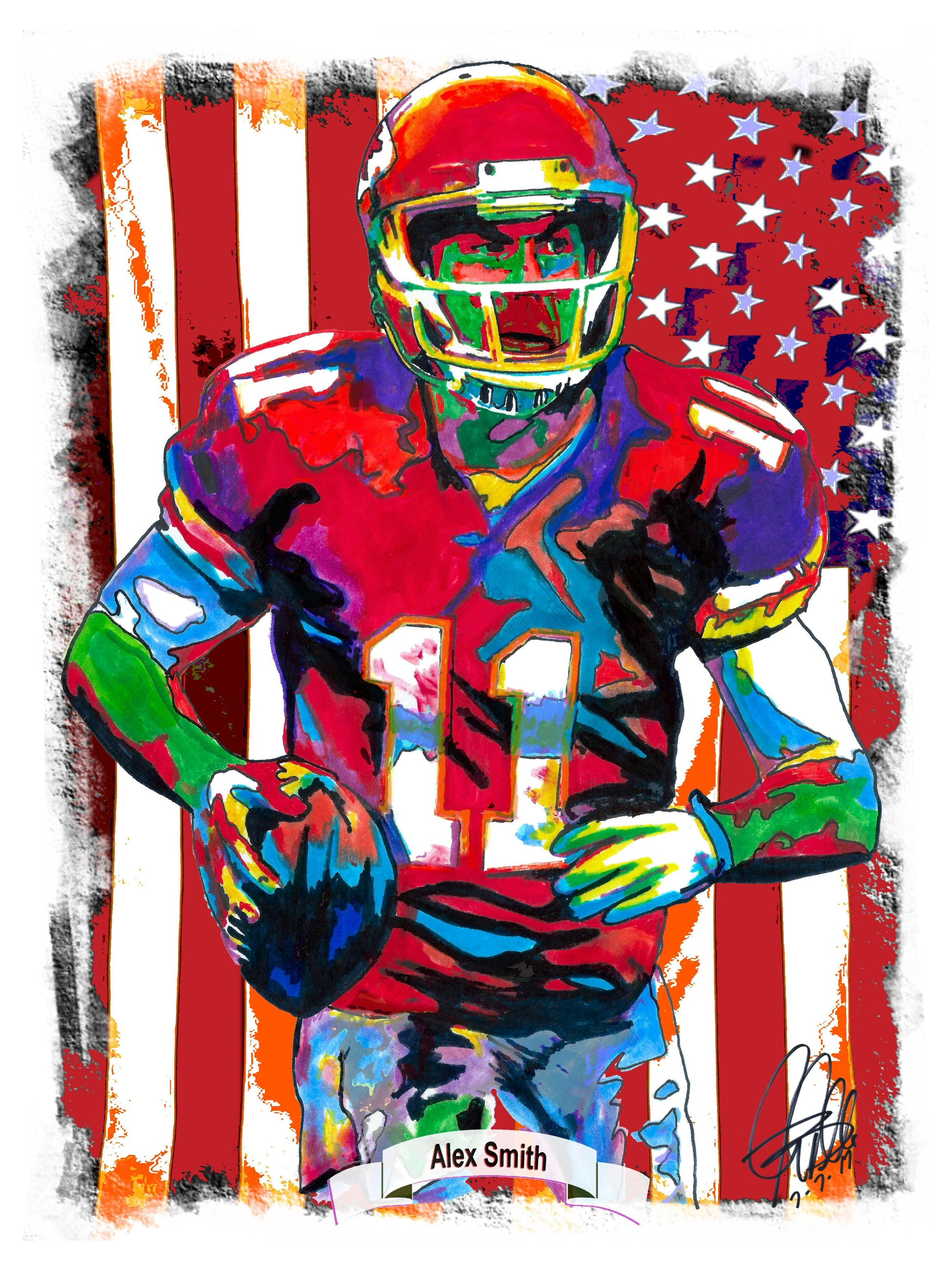 Print from Original Ink Drawing of Alex Smith of the Kansas City Chiefs. Printed on 8.5"x11" Premium Gloss High Quality Photo Paper. Print is great for matting and display – Signed & Dated by Artist on front of print - comes with Certificate of Authenticity with Your Name - will be shipped inside 12"x12"x1" sturdy container.