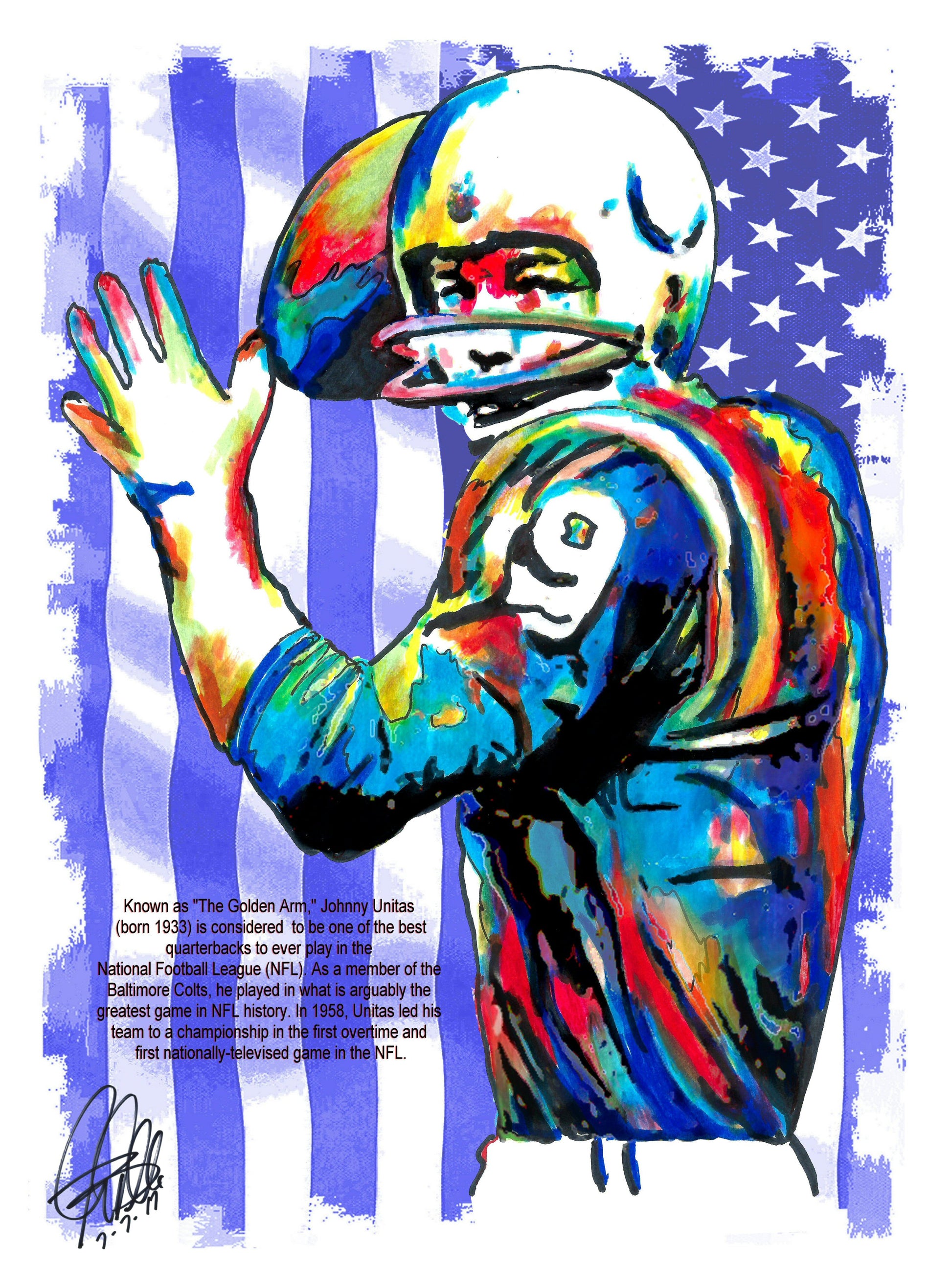 Print from Original Ink Drawing of Johnny Unitas of the Baltimore Colts. Printed on 8.5"x11" Premium Gloss High Quality Photo Paper. Print is great for matting and display – Signed & Dated by Artist on front of print - comes with Certificate of Authenticity with Your Name - will be shipped inside 12"x12"x1" sturdy container.