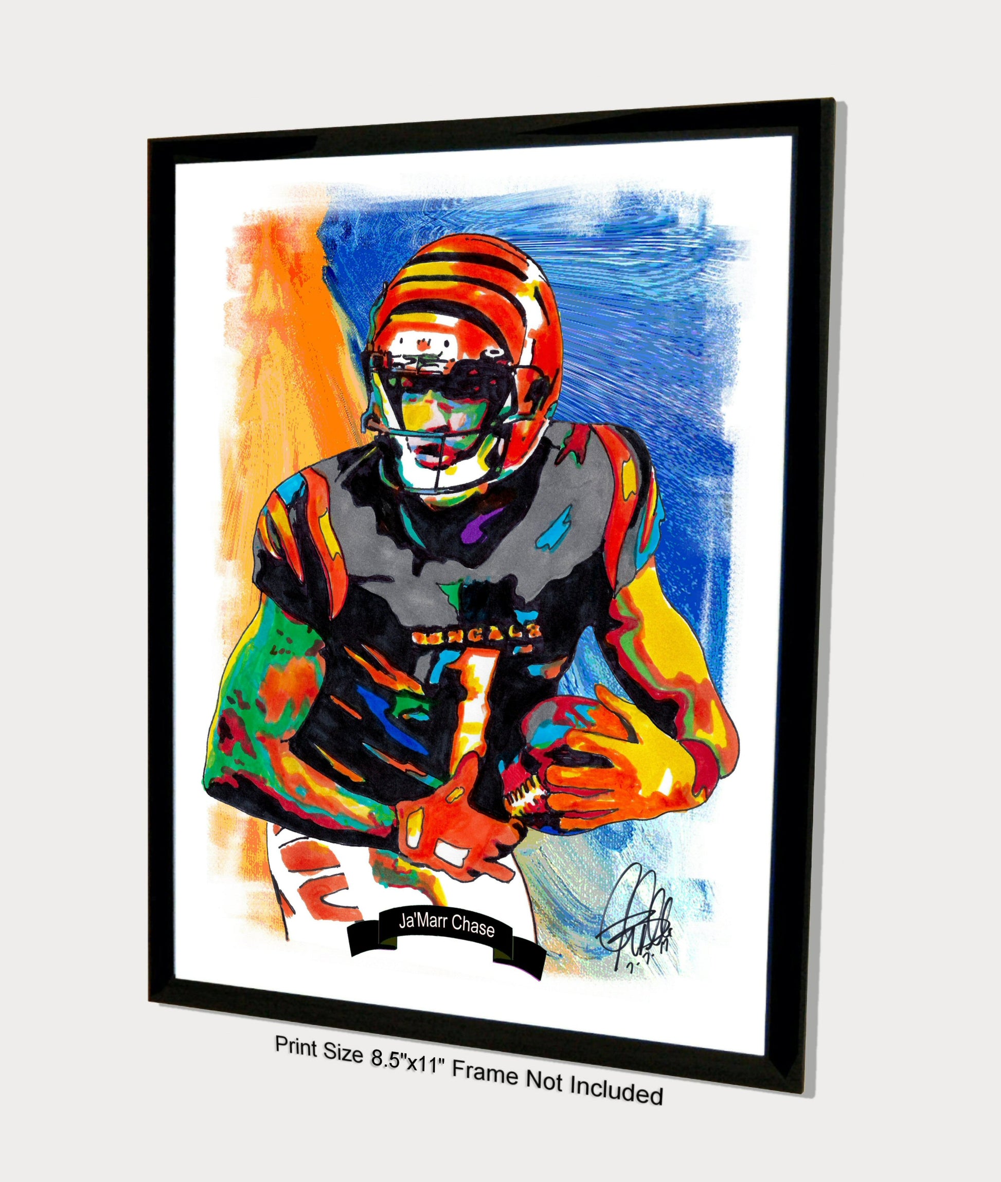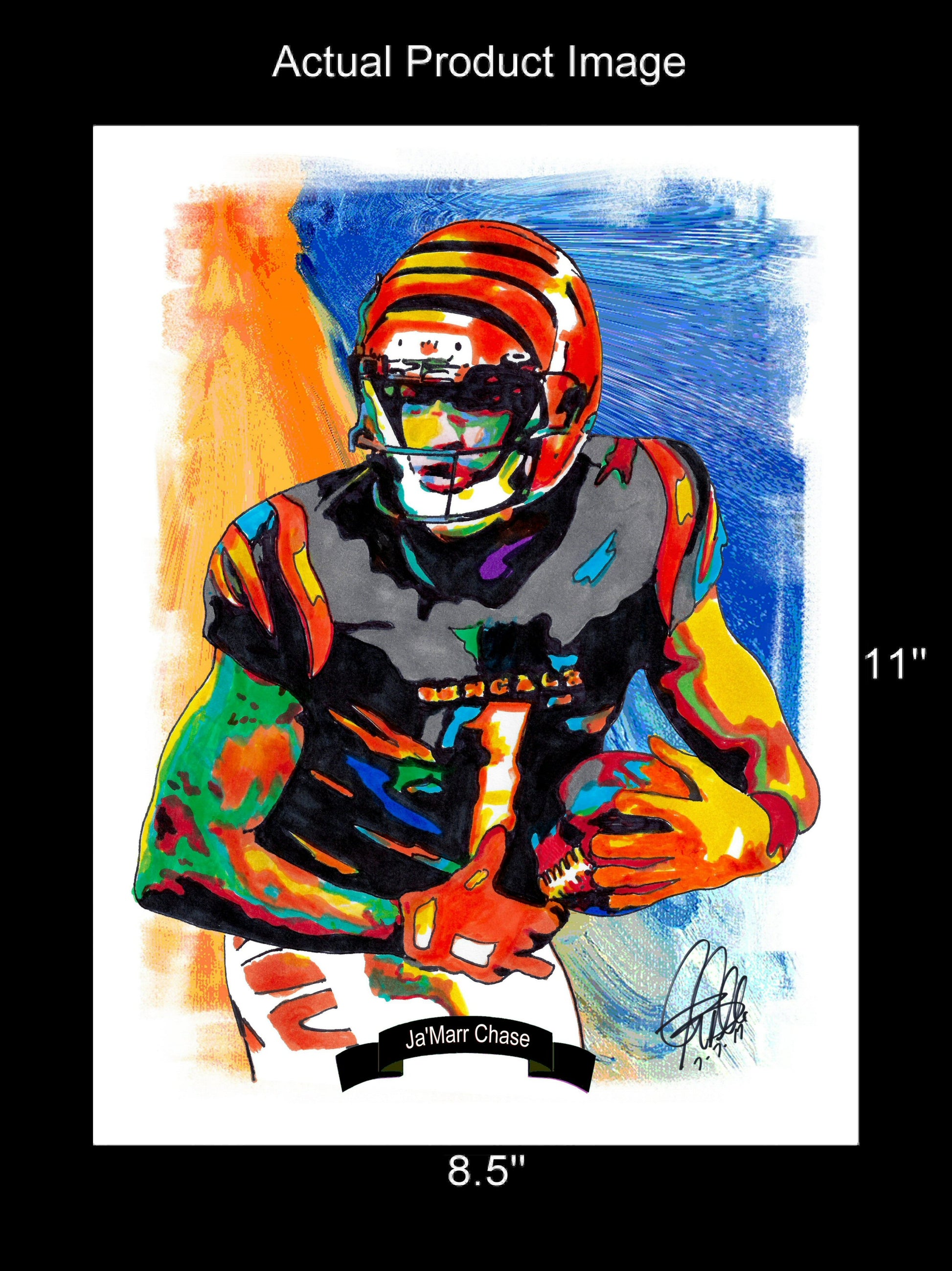 Print from Original Ink Drawing of Ja'Marr Chase of the Cincinnati Bengals. Printed on 8.5"x11" Premium Gloss High Quality Photo Paper. Print is great for matting and display – Signed & Dated by Artist on front of print - comes with Certificate of Authenticity with Your Name - will be shipped inside 12"x12"x1" sturdy container.