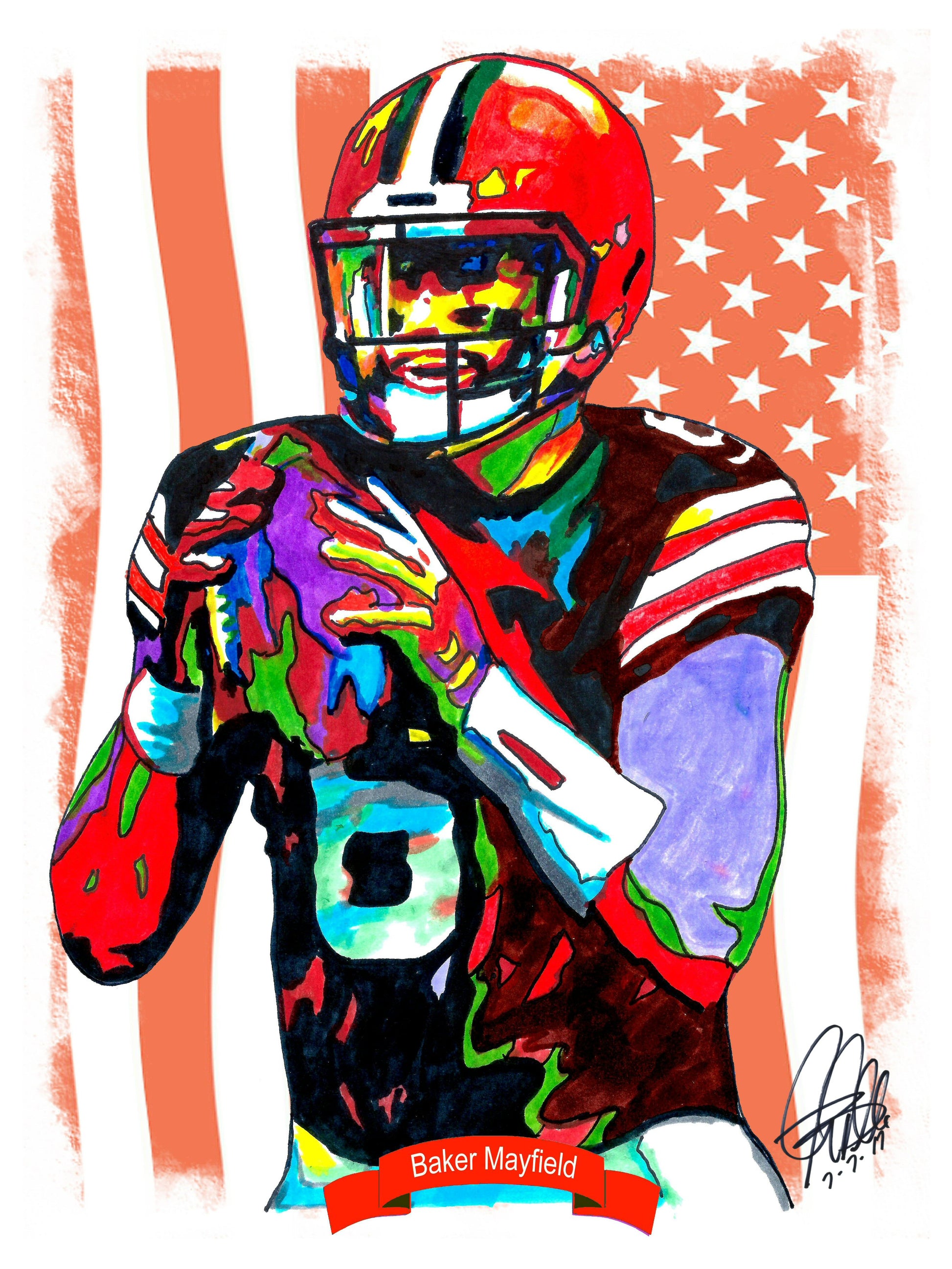 Print from Original Ink Drawing of Baker Mayfield of Cleveland Browns. Printed on 18"x24" Premium Gloss High Quality Photo Paper. Print is great for matting and display – Signed & Dated by Artist on front of print - comes with Certificate of Authenticity with Your Name - will be shipped inside 3 x 30" 2 Mil Industrial Poly Bag & 2" x 19" Kraft Mailing Tubes with End Caps - .070: thick