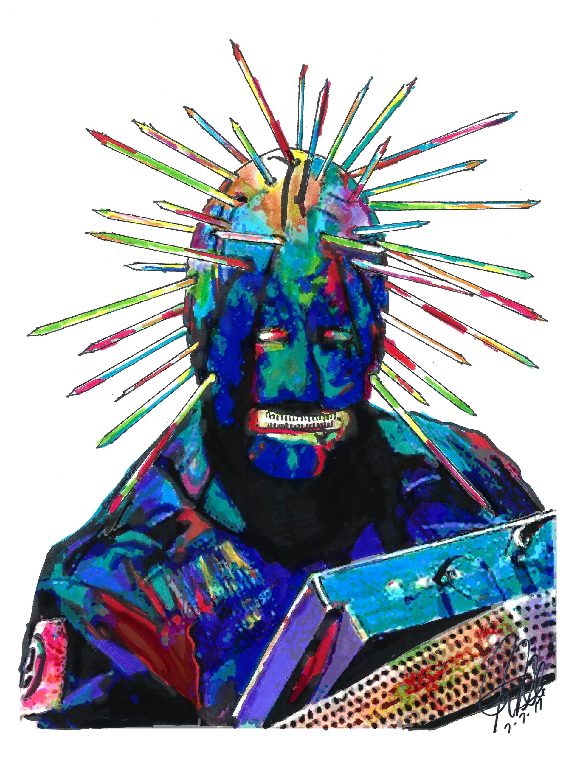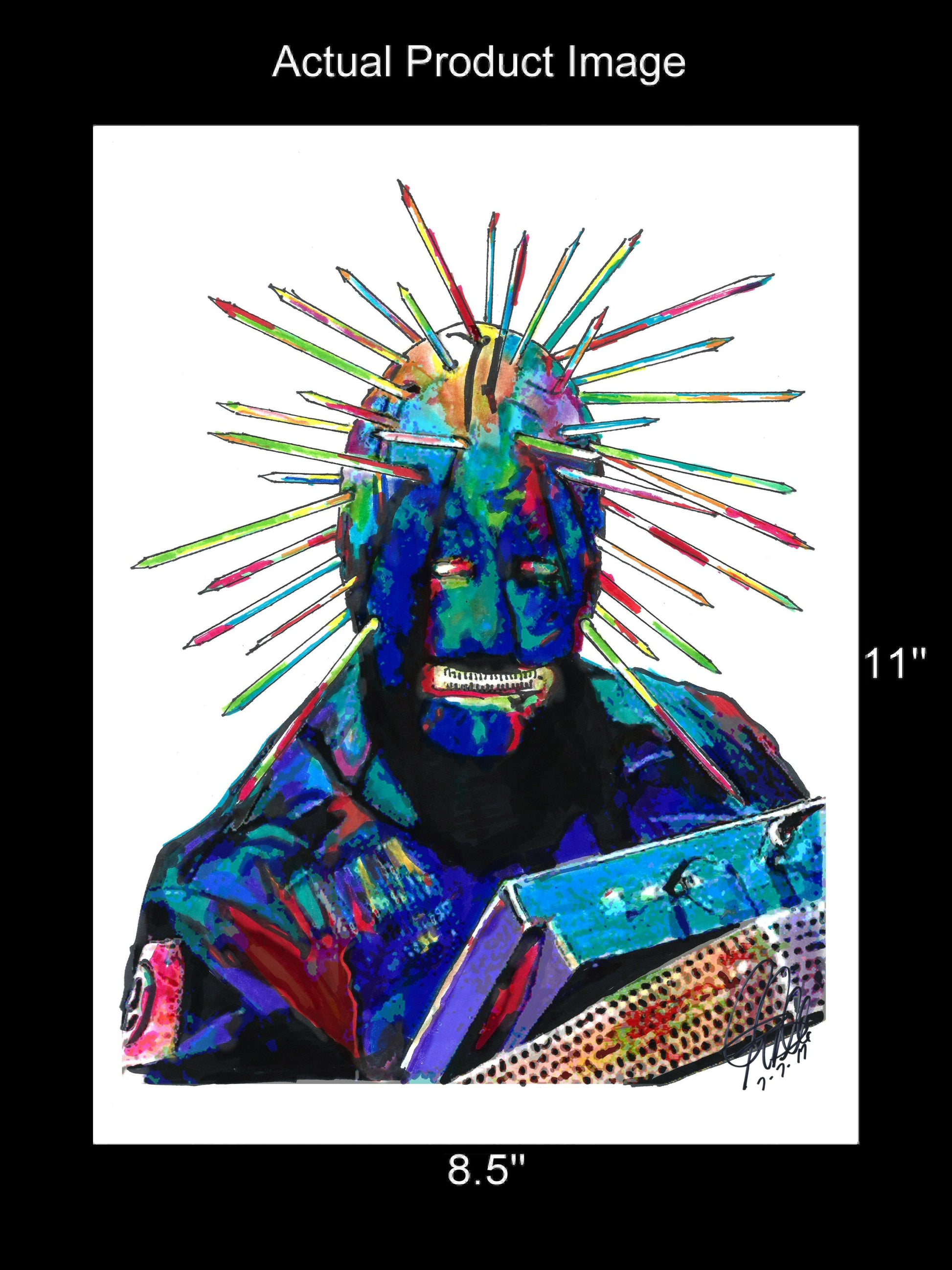 Print from Original Ink Drawing of Craig Jones of Slipknot. Printed on 8.5"x11" Premium Gloss High Quality Photo Paper. Print is great for matting and display – Signed & Dated by Artist on front of print - comes with Certificate of Authenticity with Your Name - will be shipped inside 12"x12"x1" sturdy container.