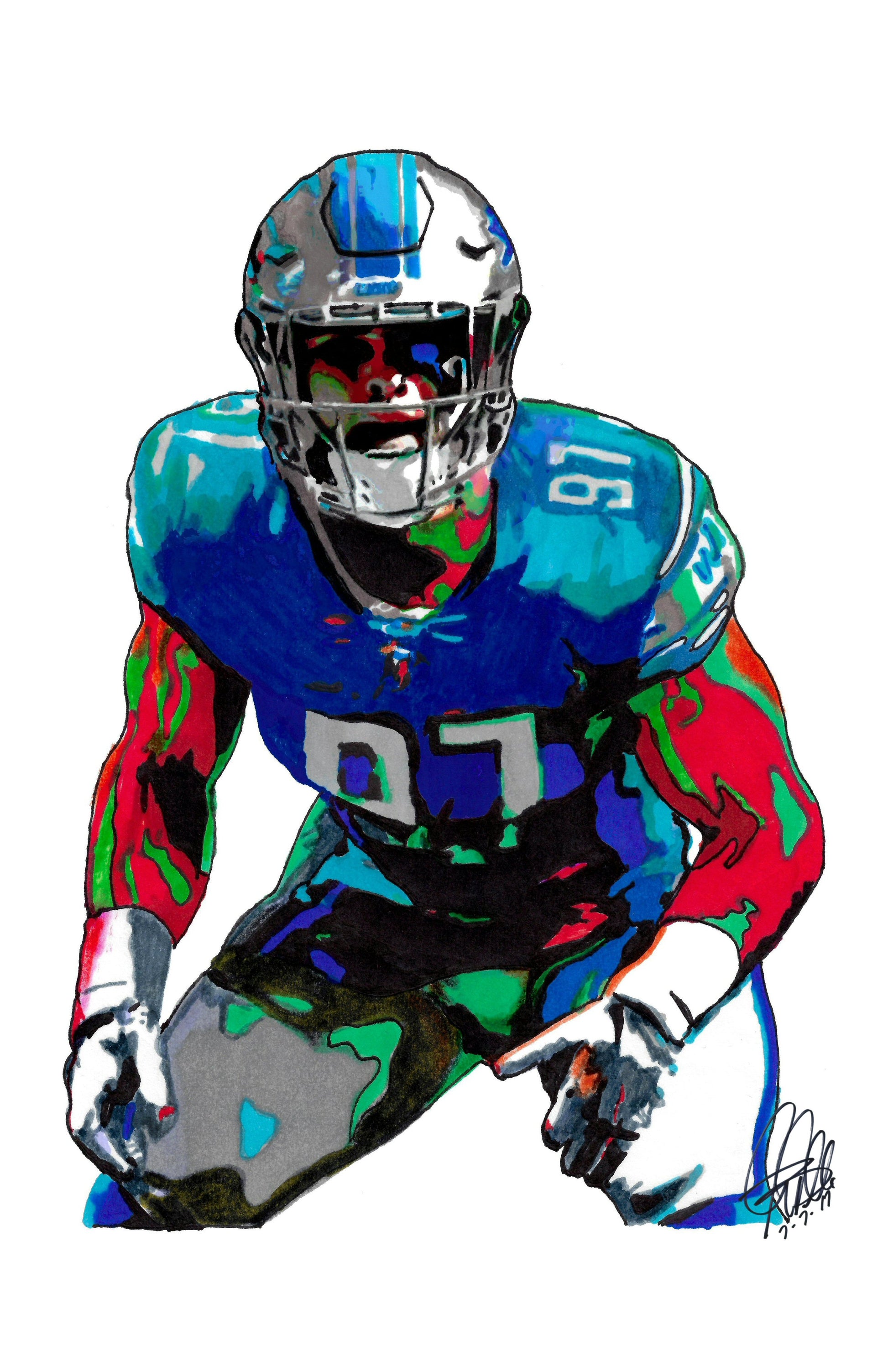Print from Original Ink Drawing of Aidan Hutchinson of the Detroit Lions. Printed on 11"x17" Premium Gloss High Quality Photo Paper. Print is great for matting and display – Signed & Dated by Artist on front of print - comes with Certificate of Authenticity with Your Name - will be shipped inside 3 x 30" 2 Mil Industrial Poly Bag & 2" x 19" Kraft Mailing Tubes with End Caps - .070: thick