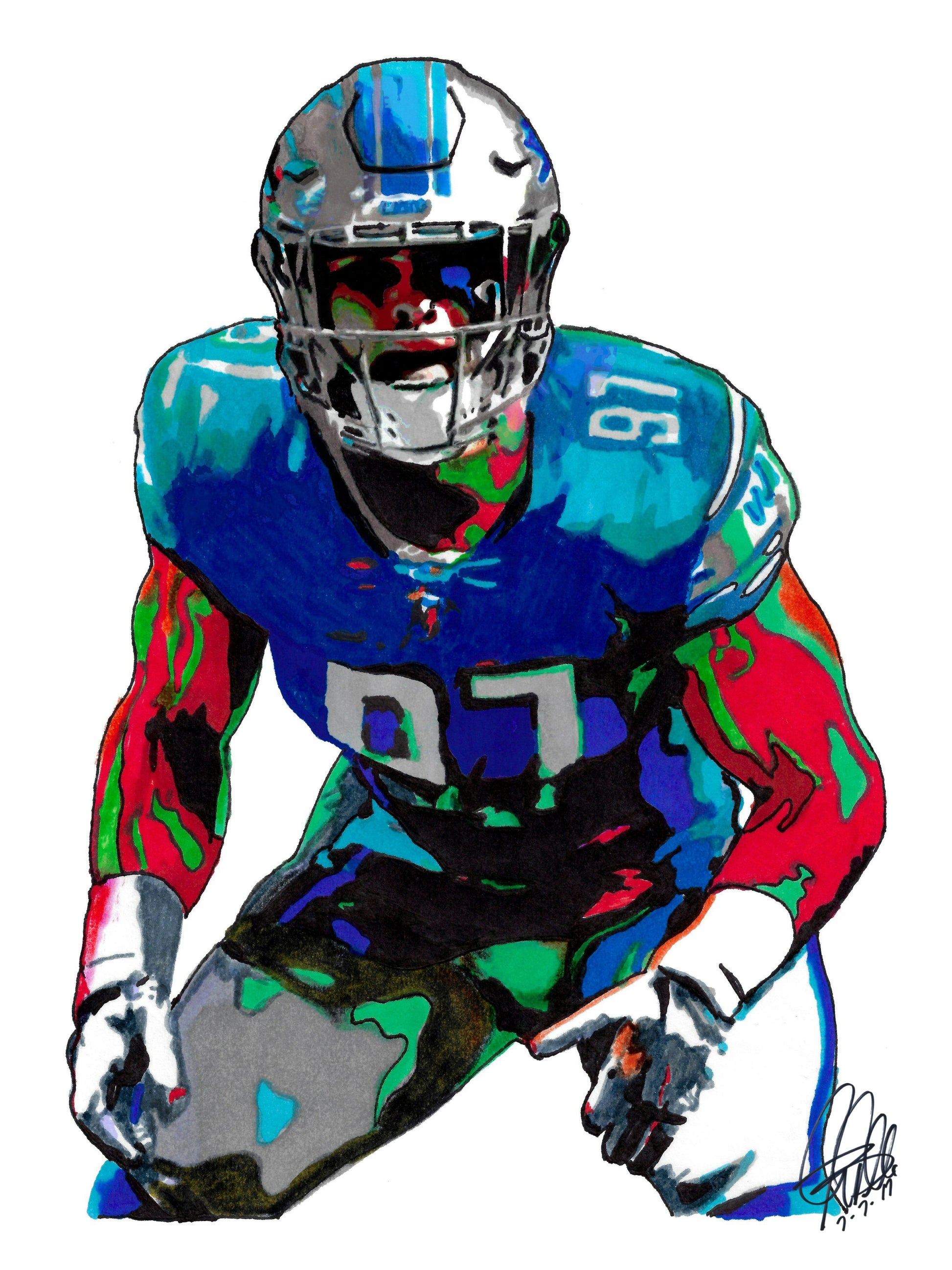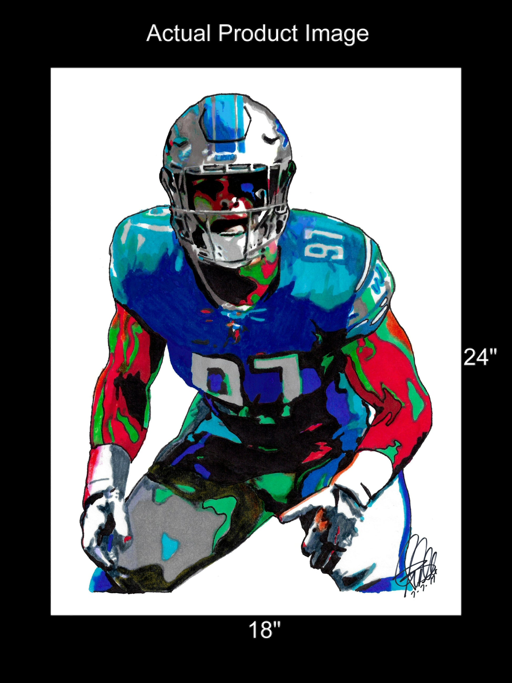 Print from Original Ink Drawing of Aidan Hutchinson of the Detroit Lions. Printed on 18"x24" Premium Gloss High Quality Photo Paper. Print is great for matting and display – Signed & Dated by Artist on front of print - comes with Certificate of Authenticity with Your Name - will be shipped inside 3 x 30" 2 Mil Industrial Poly Bag & 2" x 19" Kraft Mailing Tubes with End Caps - .070: thick