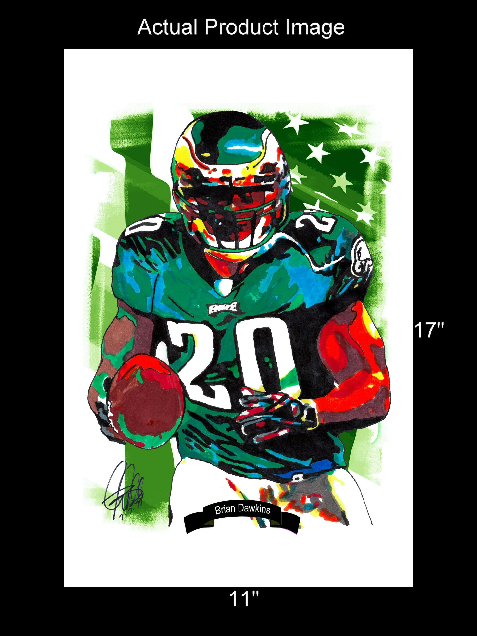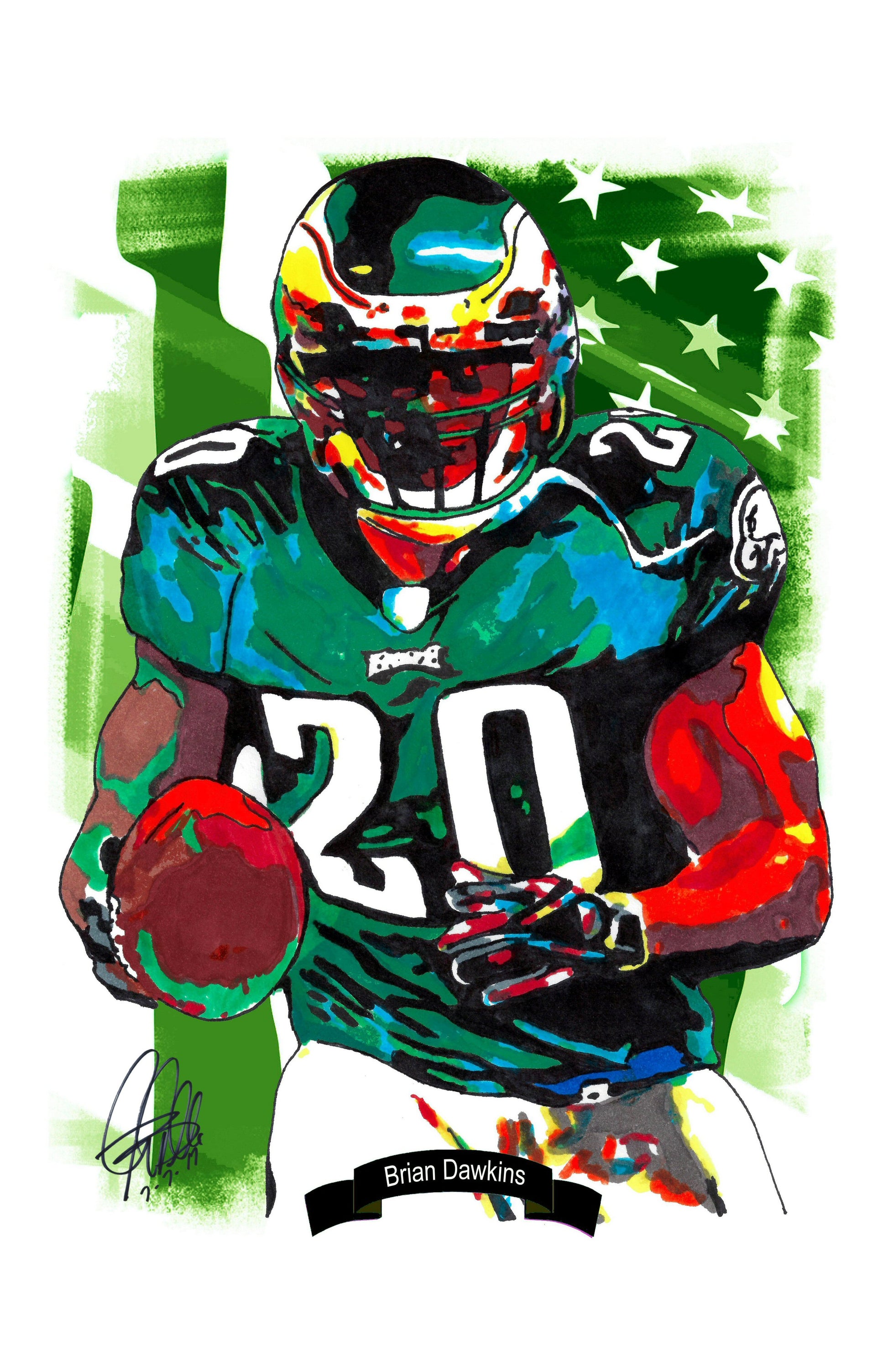 Print from Original Ink Drawing of Brian Dawkins of the Philadelphia Eagles. Printed on 11"x17" Premium Gloss High Quality Photo Paper. Print is great for matting and display – Signed & Dated by Artist on front of print - comes with Certificate of Authenticity with Your Name - will be shipped inside 3 x 30" 2 Mil Industrial Poly Bag & 2" x 19" Kraft Mailing Tubes with End Caps - .070: thick