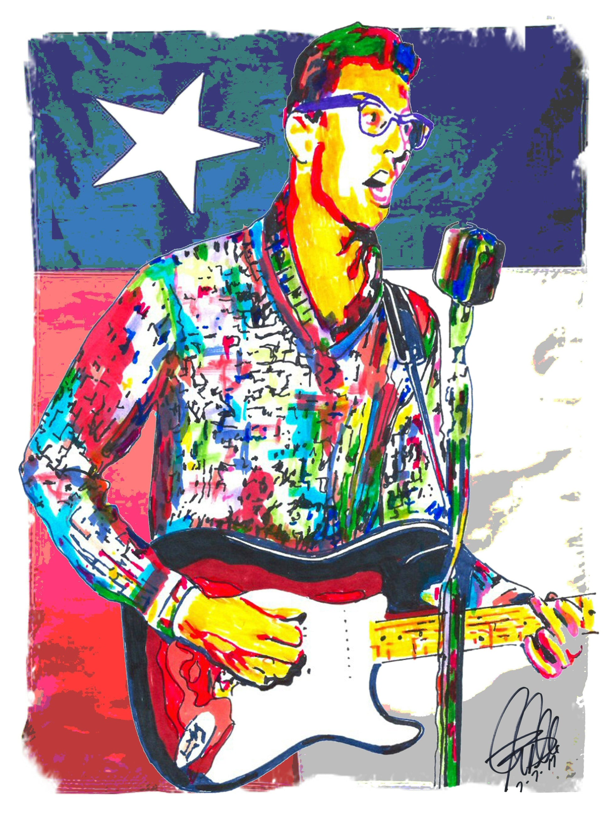 Print from Original Ink Drawing of Buddy Holly . Printed on 8.5"x11" Premium Gloss High Quality Photo Paper. Print is great for matting and display – Signed & Dated by Artist on front of print - comes with Certificate of Authenticity with Your Name - will be shipped inside 12"x12"x1" sturdy container.