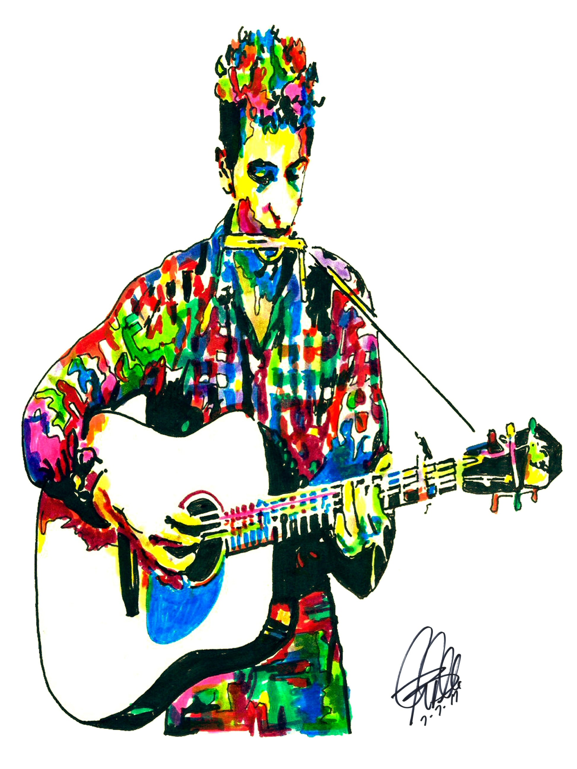 Print from Original Ink Drawing of Bob Dylan. Printed on 8.5"x11" Premium Gloss High Quality Photo Paper. Print is great for matting and display – Signed & Dated by Artist on front of print - comes with Certificate of Authenticity with Your Name - will be shipped inside 12"x12"x1" sturdy container.