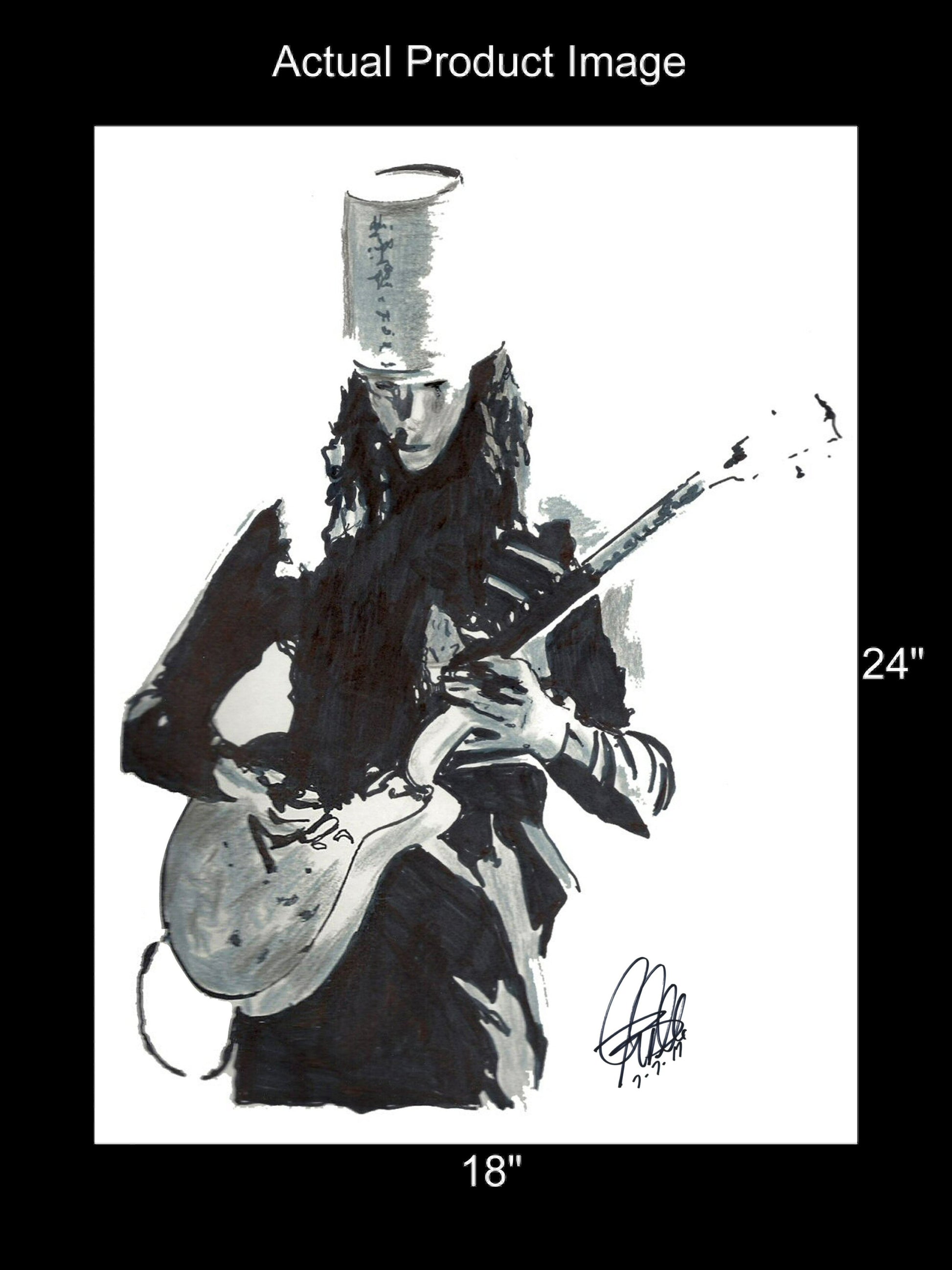 Print from Original Ink Drawing of Buckethead. Printed on 18"x24" Premium Gloss High Quality Photo Paper. Print is great for matting and display – Signed & Dated by Artist on front of print - comes with Certificate of Authenticity with Your Name - will be shipped inside 3 x 30" 2 Mil Industrial Poly Bag & 2" x 19" Kraft Mailing Tubes with End Caps - .070: thick