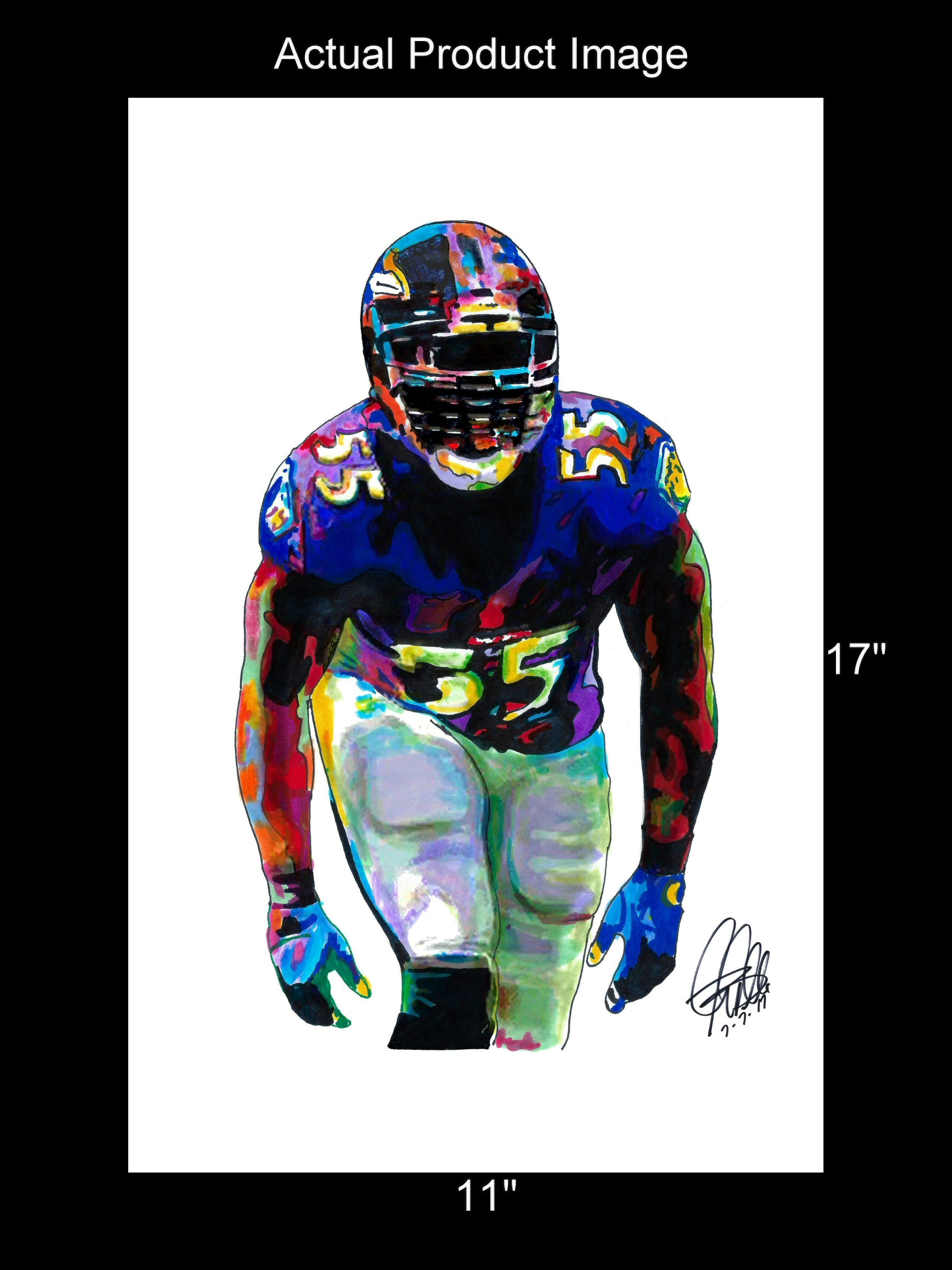 Print from Original Ink Drawing of Terrell Suggs of the Baltimore Ravens. Printed on 11"x17" Premium Gloss High Quality Photo Paper. Print is great for matting and display – Signed & Dated by Artist on front of print - comes with Certificate of Authenticity with Your Name - will be shipped inside 3 x 30" 2 Mil Industrial Poly Bag & 2" x 19" Kraft Mailing Tubes with End Caps - .070: thick