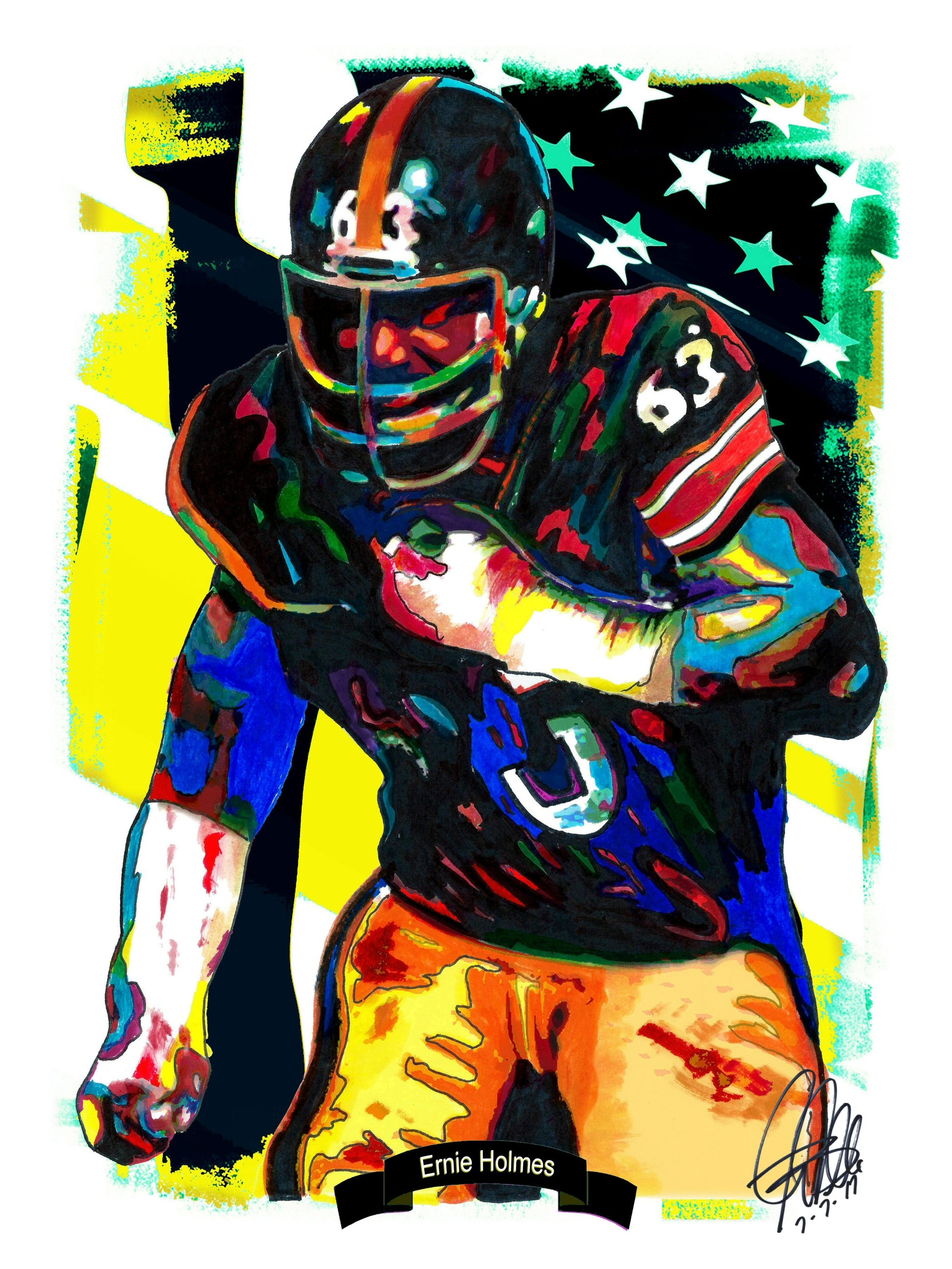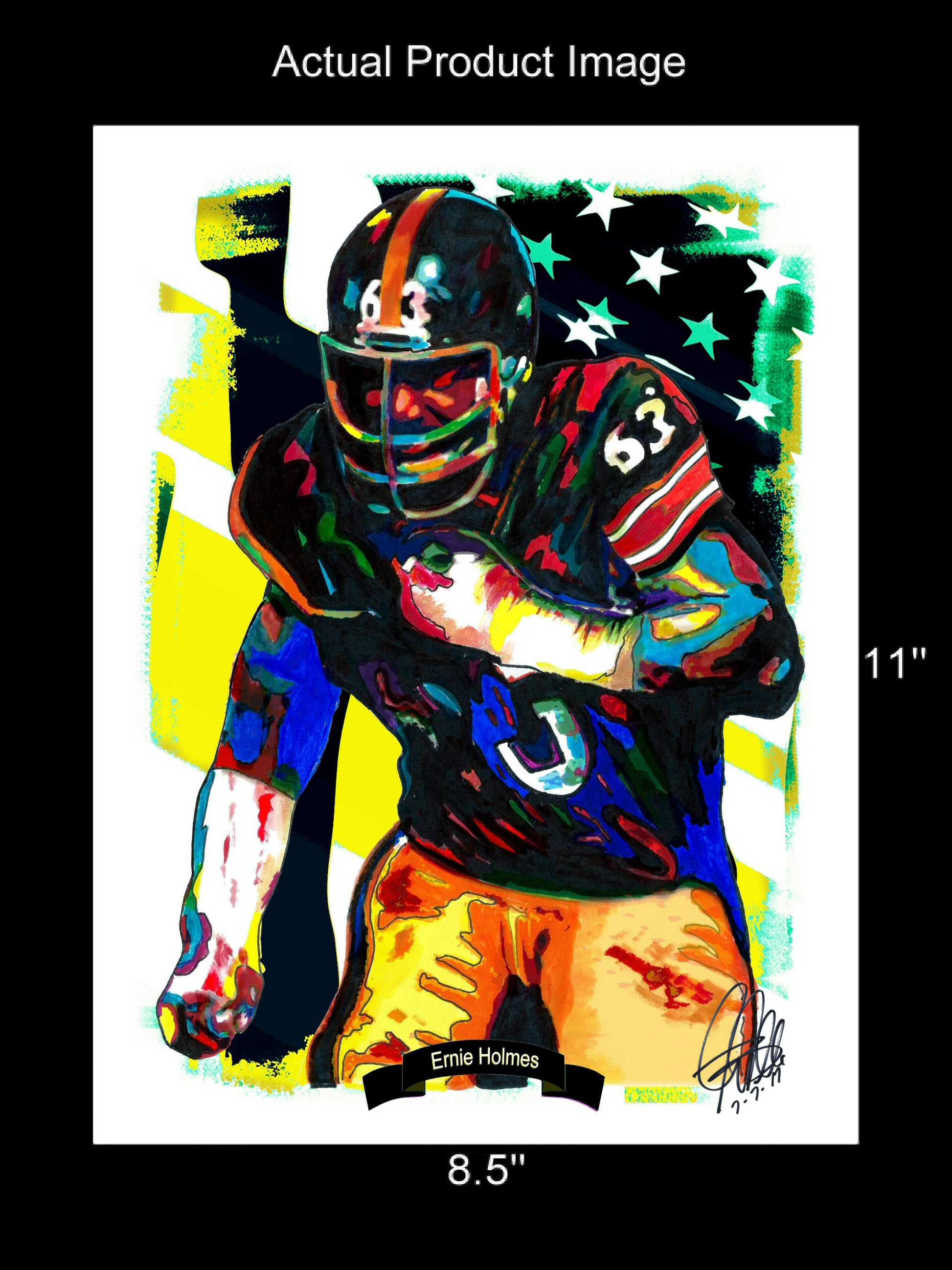 Print from Original Ink Drawing of Ernie Holmes of the Pittsburgh Steelers. Printed on 8.5"x11" Premium Gloss High Quality Photo Paper. Print is great for matting and display – Signed & Dated by Artist on front of print - comes with Certificate of Authenticity with Your Name - will be shipped inside 12"x12"x1" sturdy container.