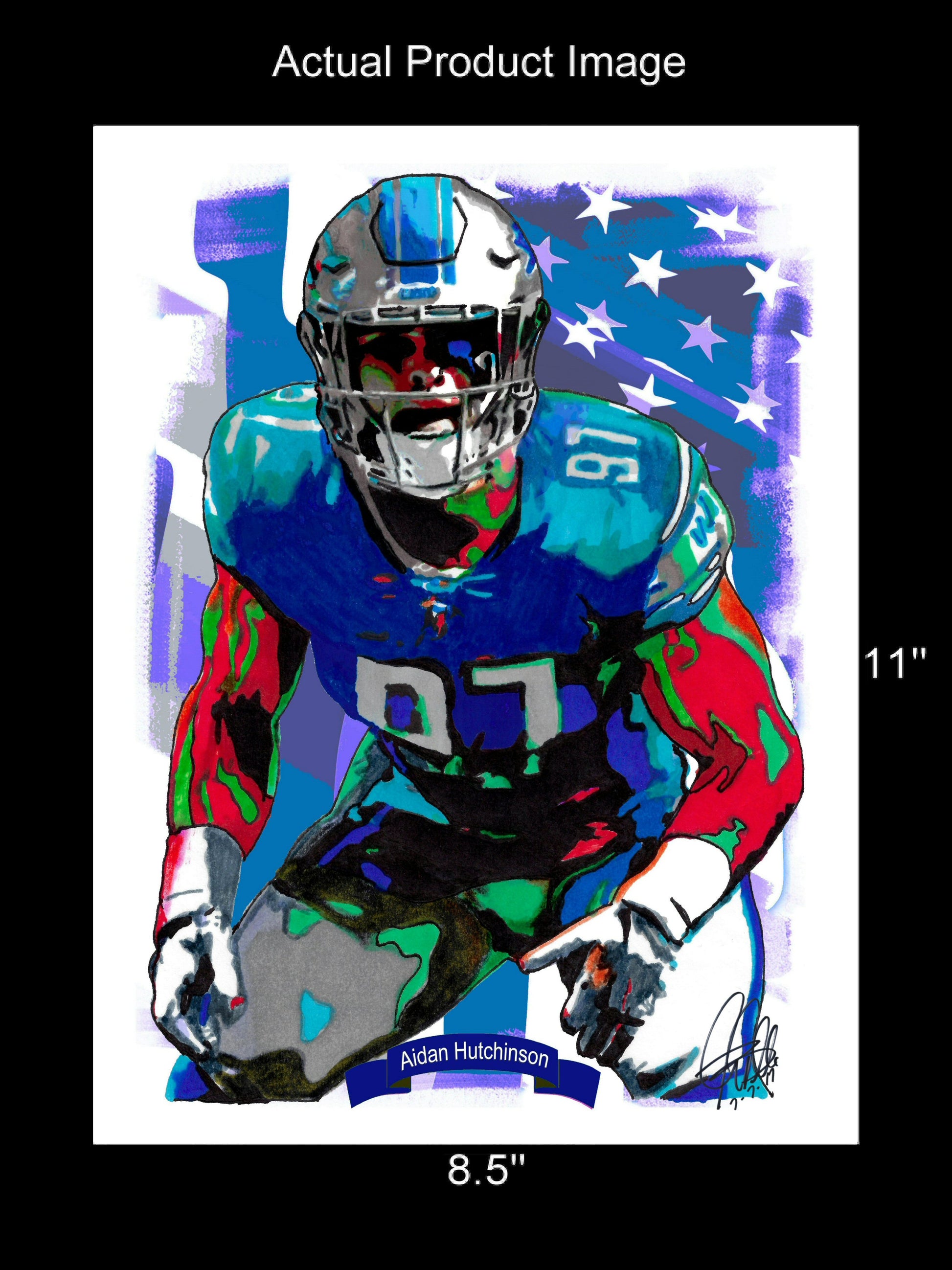 Print from Original Ink Drawing of Aidan Hutchinson of the Detroit Lions. Printed on 8.5"x11" Premium Gloss High Quality Photo Paper. Print is great for matting and display – Signed & Dated by Artist on front of print - comes with Certificate of Authenticity with Your Name - will be shipped inside 12"x12"x1" sturdy container.