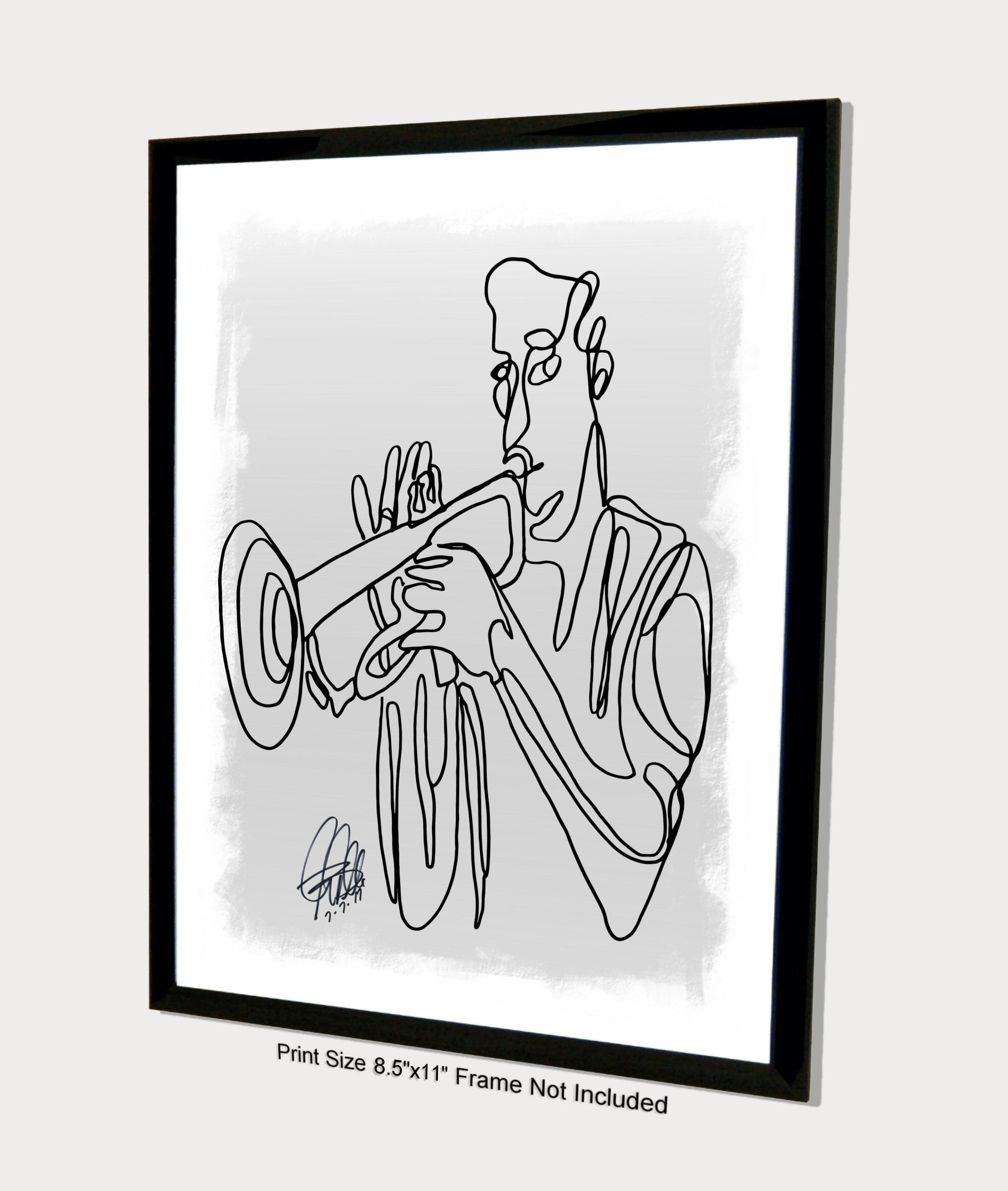 Print from Original Ink Drawing of Trumpet Player. Printed on 8.5"x11" Premium Gloss High Quality Photo Paper. Print is great for matting and display – Signed & Dated by Artist on front of print - comes with Certificate of Authenticity with Your Name - will be shipped inside 12"x12"x1" sturdy container.