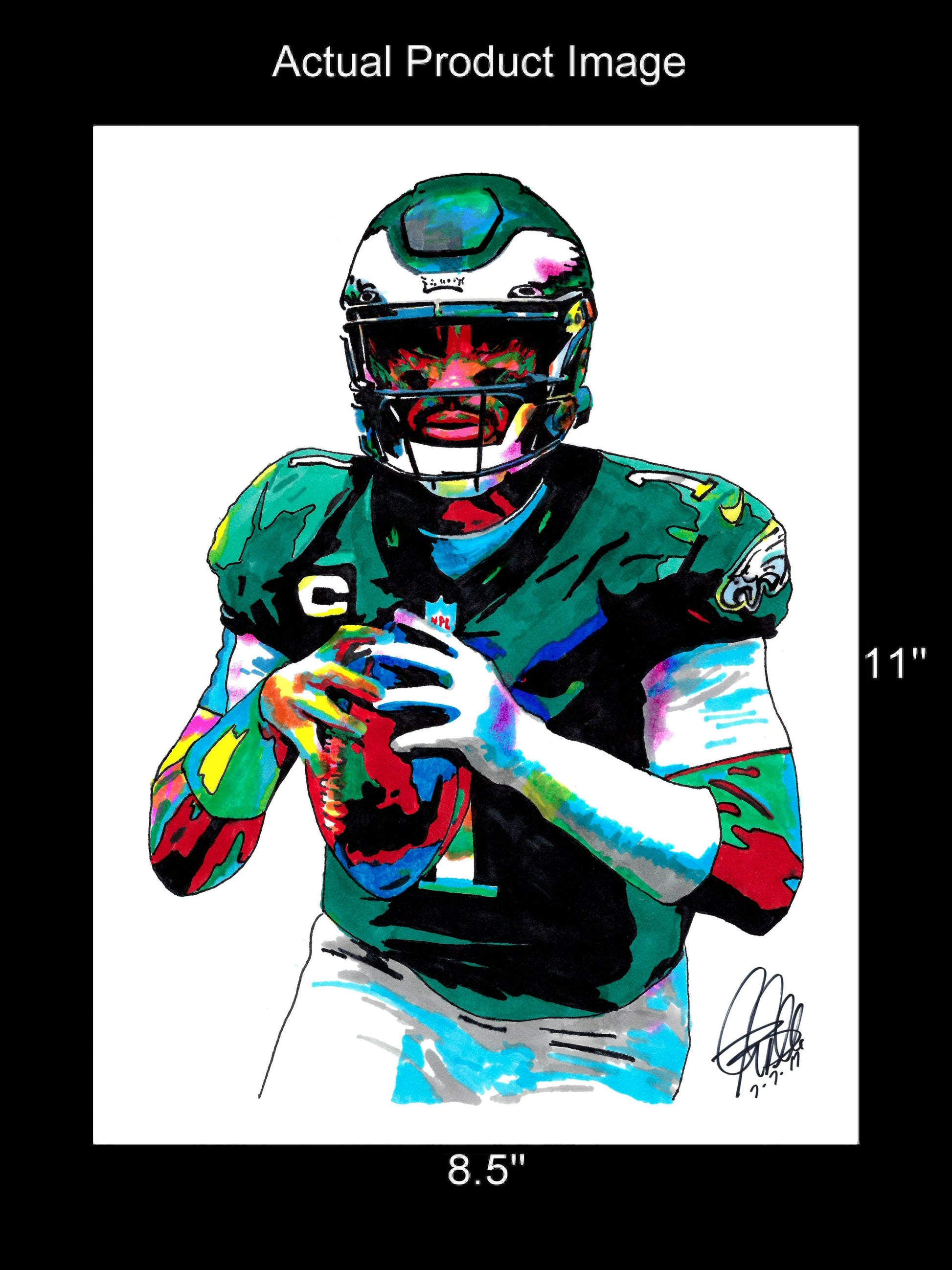 Print from Original Ink Drawing of Jalen Hurts of the Philadelphia Eagles. Printed on 8.5"x11" Premium Gloss High Quality Photo Paper. Print is great for matting and display – Signed & Dated by Artist on front of print - comes with Certificate of Authenticity with Your Name - will be shipped inside 12"x12"x1" sturdy container.