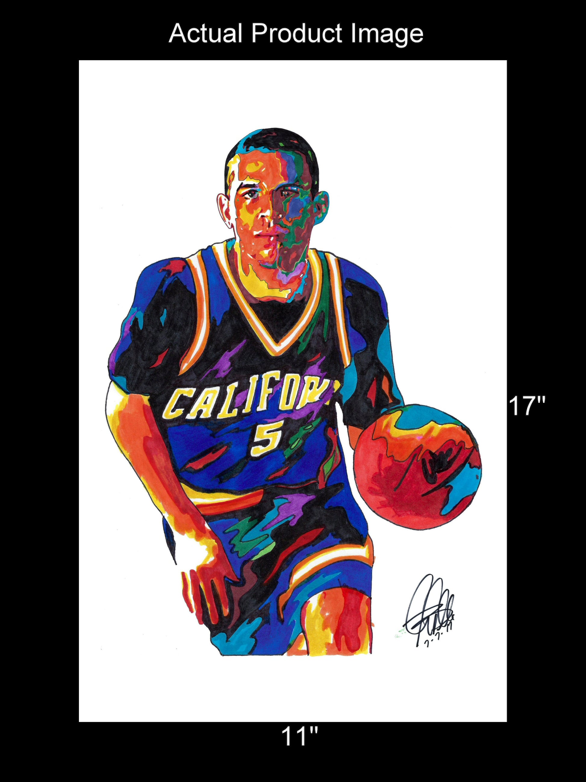 Print from Original Ink Drawing of Jason Kidd of the California Golden Bears. Printed on 11"x17" Premium Gloss High Quality Photo Paper. Print is great for matting and display – Signed & Dated by Artist on front of print - comes with Certificate of Authenticity with Your Name - will be shipped inside 3 x 30" 2 Mil Industrial Poly Bag & 2" x 19" Kraft Mailing Tubes with End Caps - .070: thick