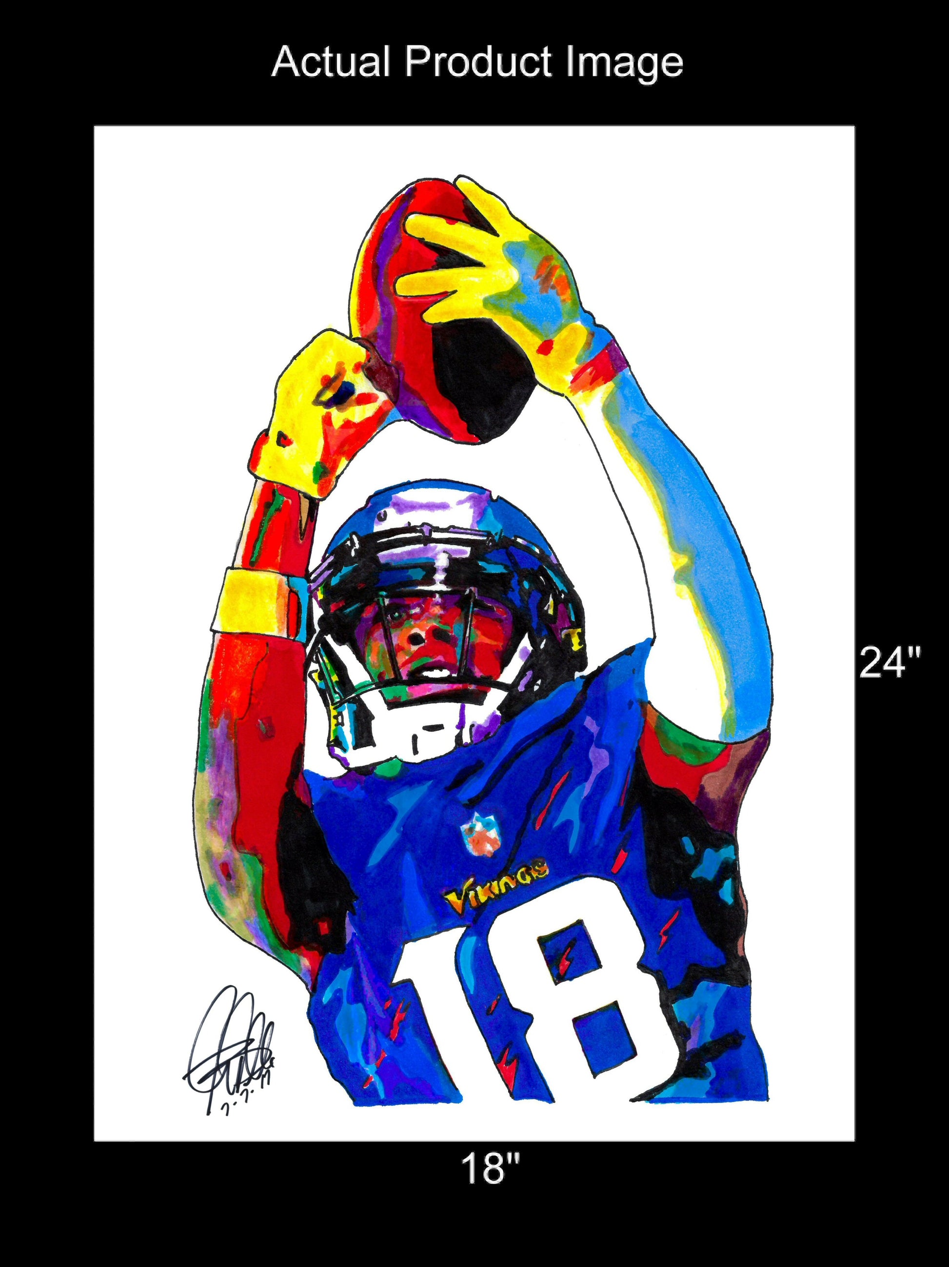 Print from Original Ink Drawing of Justin Jefferson of the Minnesota Vikings. Printed on 18"x24" Premium Gloss High Quality Photo Paper. Print is great for matting and display – Signed & Dated by Artist on front of print - comes with Certificate of Authenticity with Your Name - will be shipped inside 3 x 30" 2 Mil Industrial Poly Bag & 2" x 19" Kraft Mailing Tubes with End Caps - .070: thick