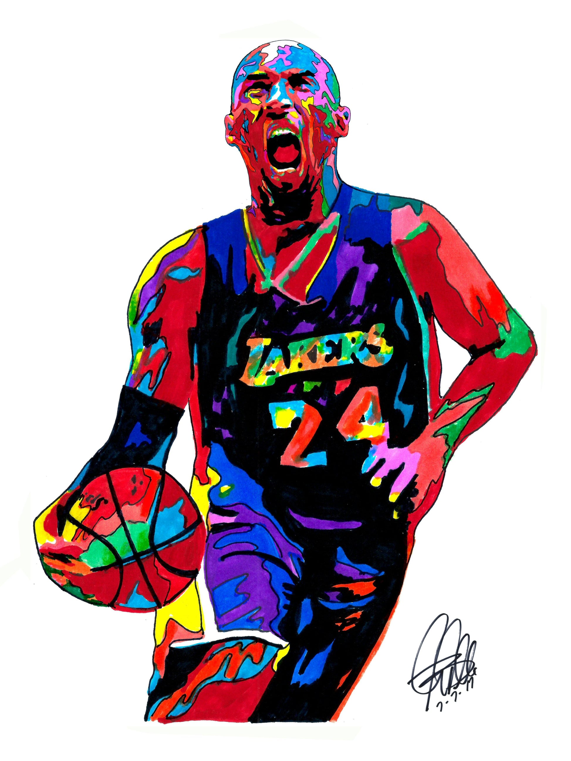 Print from Original Ink Drawing of Kobe Bryant of the Los Angeles Lakers. Printed on 18"x24" Premium Gloss High Quality Photo Paper. Print is great for matting and display – Signed & Dated by Artist on front of print - comes with Certificate of Authenticity with Your Name - will be shipped inside 3 x 30" 2 Mil Industrial Poly Bag & 2" x 19" Kraft Mailing Tubes with End Caps - .070: thick