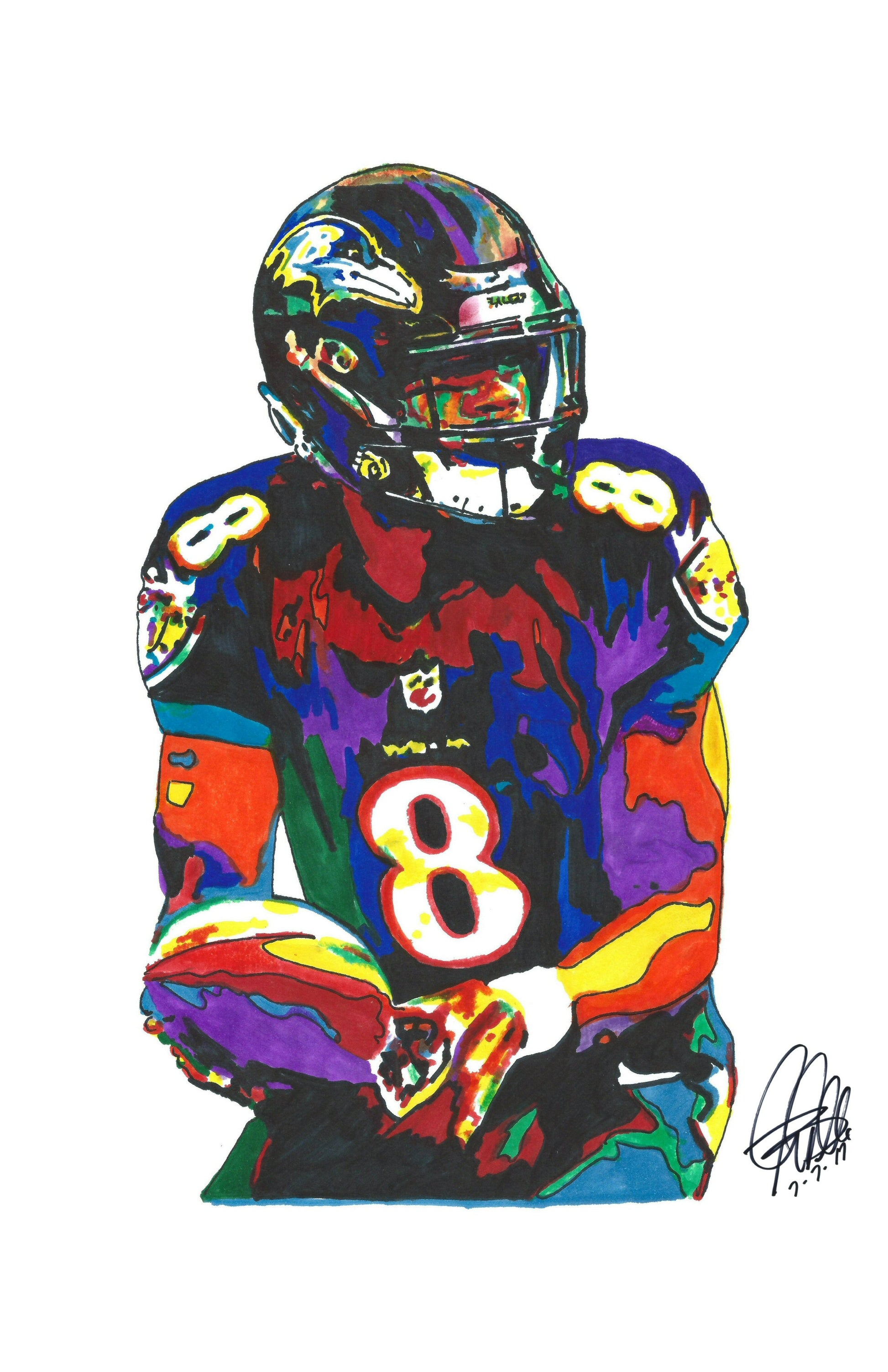 Print from Original Ink Drawing of Lamar Jackson of the Baltimore Ravens. Printed on 11"x17" Premium Gloss High Quality Photo Paper. Print is great for matting and display – Signed & Dated by Artist on front of print - comes with Certificate of Authenticity with Your Name - will be shipped inside 3 x 30" 2 Mil Industrial Poly Bag & 2" x 19" Kraft Mailing Tubes with End Caps - .070: thick