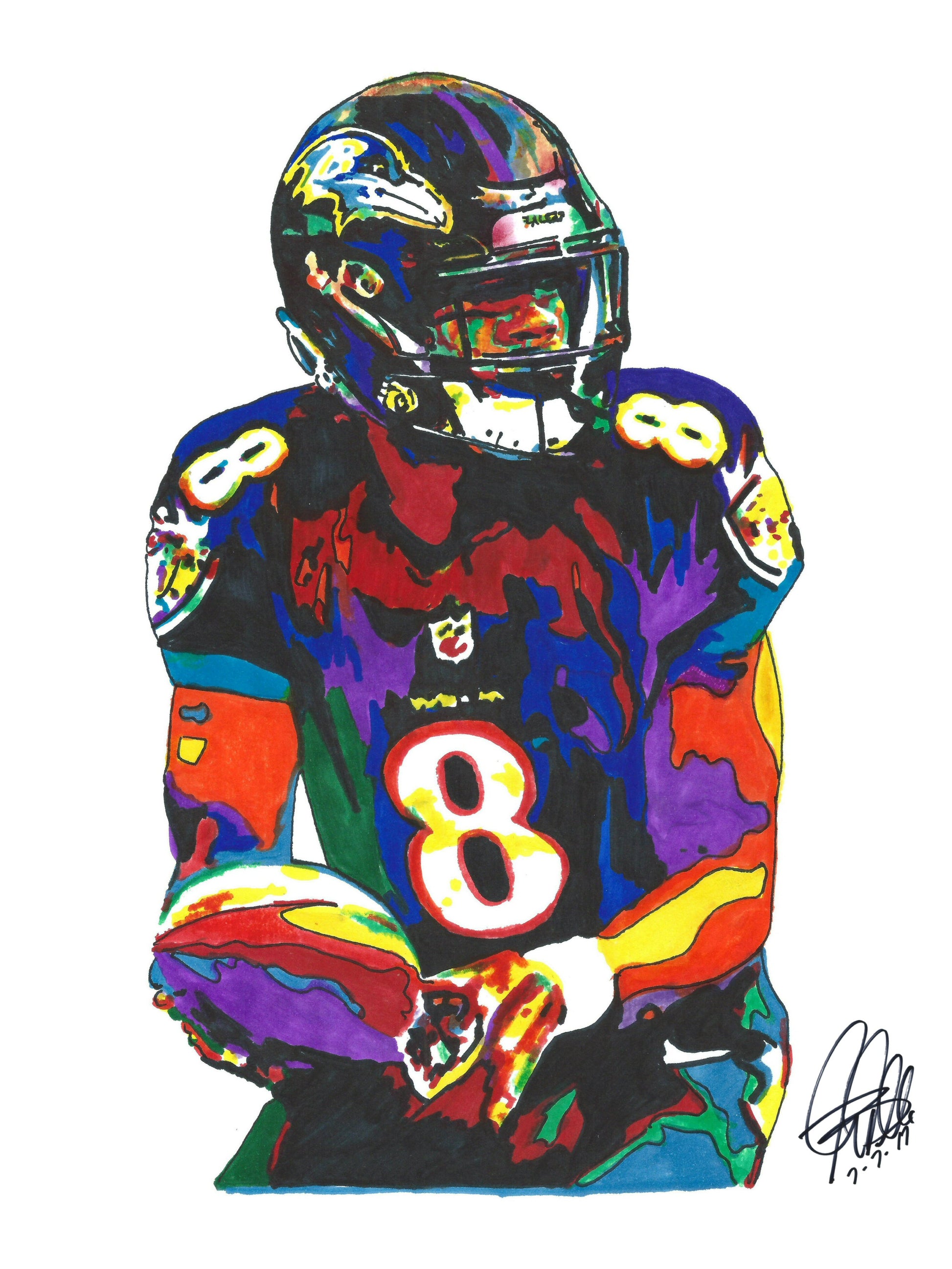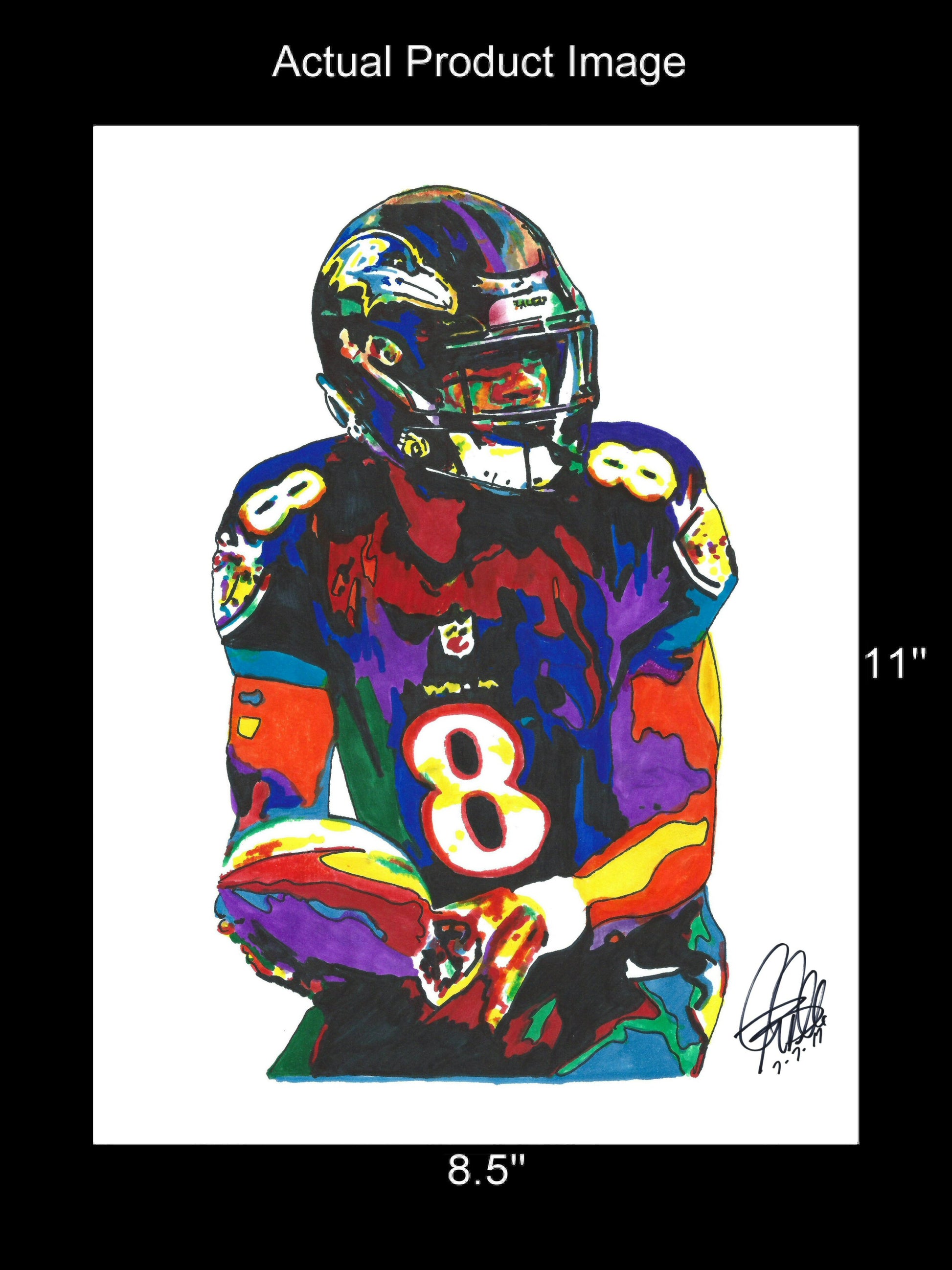 Print from Original Ink Drawing of Lamar Jackson of the Baltimore Ravens. Printed on 8.5"x11" Premium Gloss High Quality Photo Paper. Print is great for matting and display – Signed & Dated by Artist on front of print - comes with Certificate of Authenticity with Your Name - will be shipped inside 12"x12"x1" sturdy container.