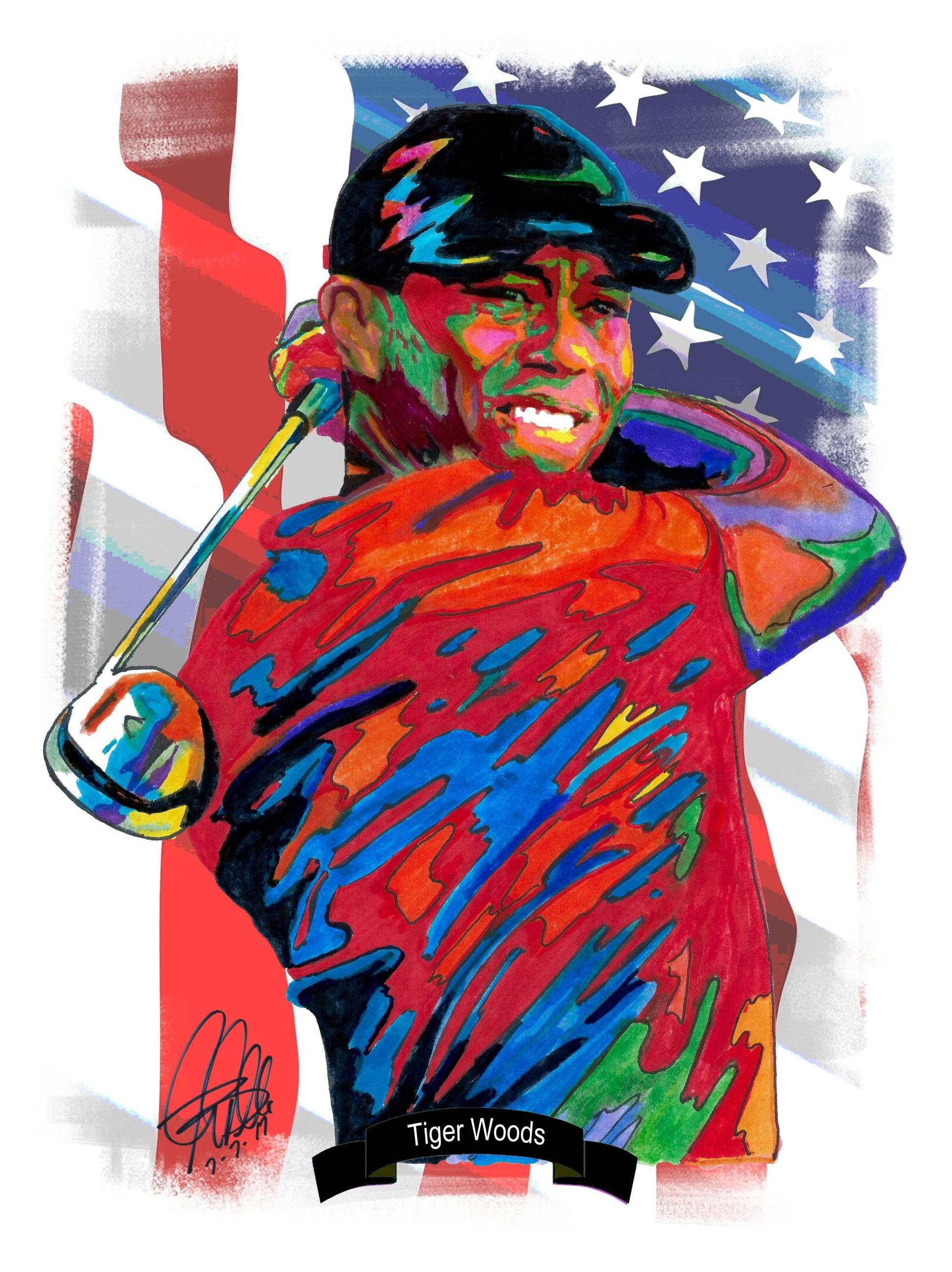 Print from Original Ink Drawing of Tiger Woods. Printed on 18"x24" Premium Gloss High Quality Photo Paper. Print is great for matting and display – Signed & Dated by Artist on front of print - comes with Certificate of Authenticity with Your Name - will be shipped inside 3 x 30" 2 Mil Industrial Poly Bag & 2" x 19" Kraft Mailing Tubes with End Caps - .070: thick