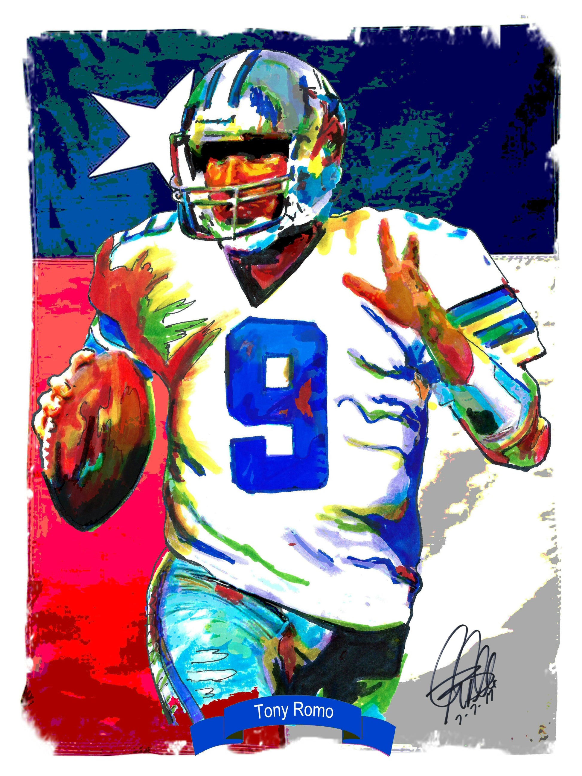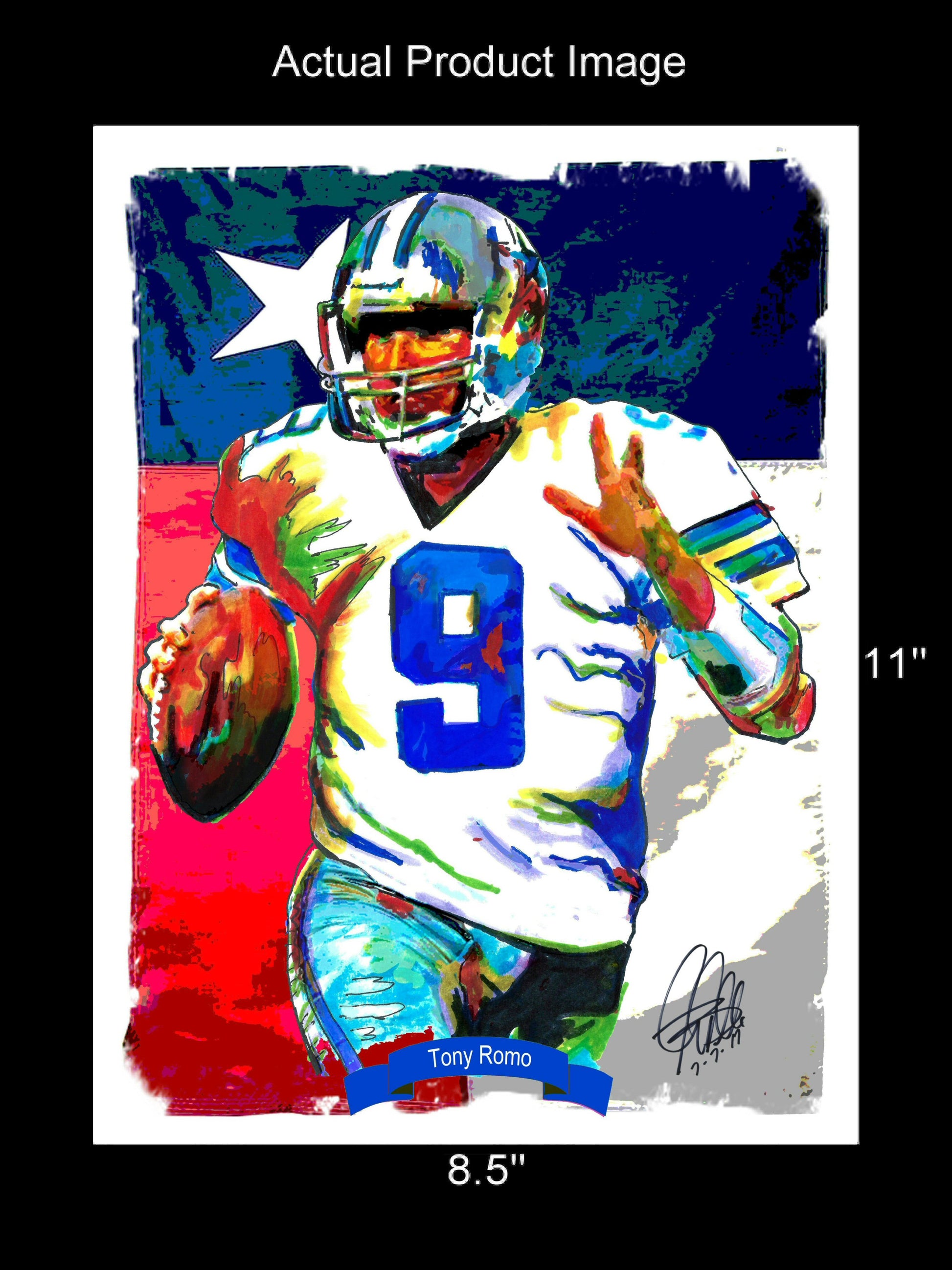 Print from Original Ink Drawing of Tony Romo of the Dallas Cowboys. Printed on 8.5"x11" Premium Gloss High Quality Photo Paper. Print is great for matting and display – Signed & Dated by Artist on front of print - comes with Certificate of Authenticity with Your Name - will be shipped inside 12"x12"x1" sturdy container.