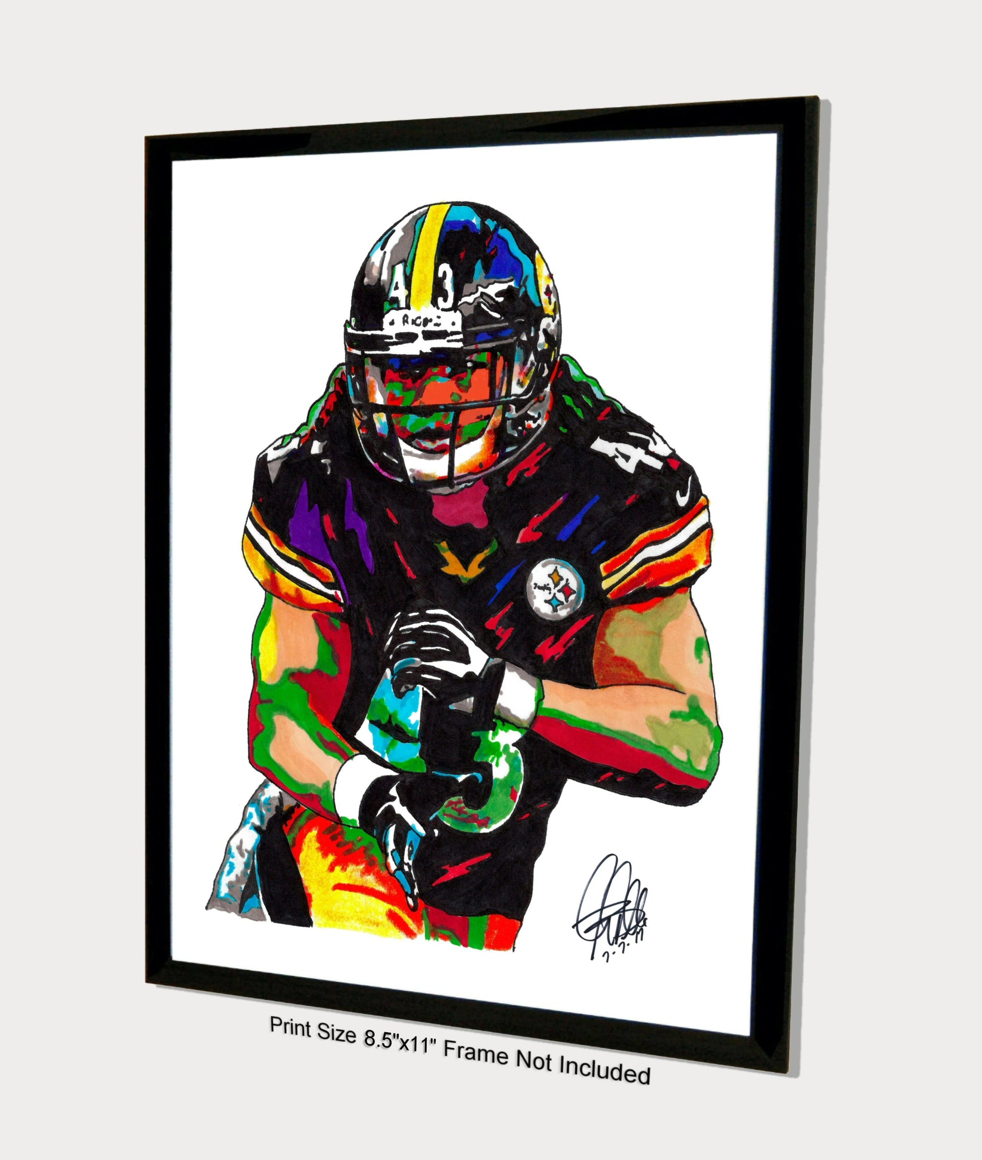 Print from Original Ink Drawing of Troy Polamalu of the Pittsburgh Steelers. Printed on 8.5"x11" Premium Gloss High Quality Photo Paper. Print is great for matting and display – Signed & Dated by Artist on front of print - comes with Certificate of Authenticity with Your Name - will be shipped inside 12"x12"x1" sturdy container.