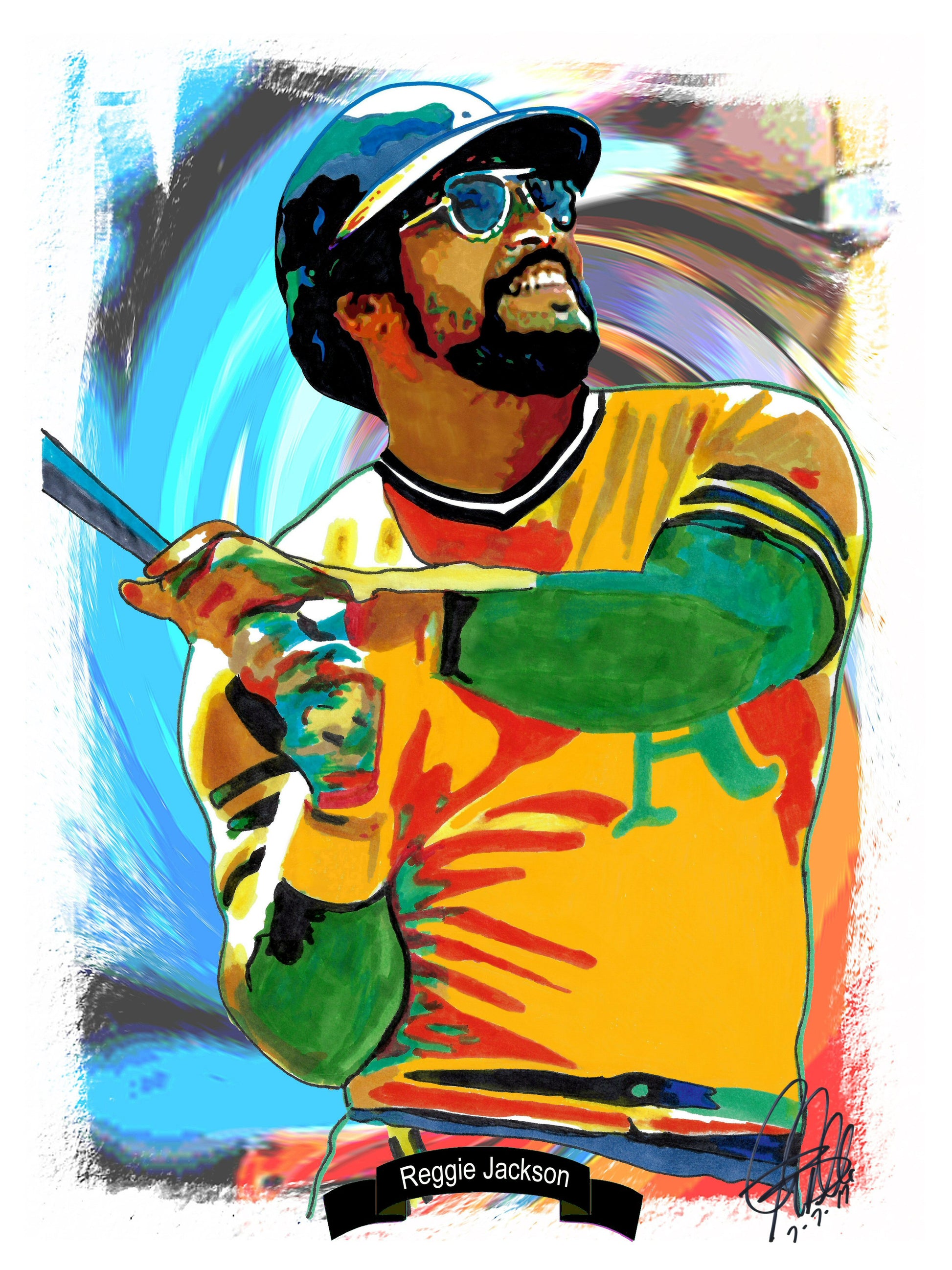 Print from Original Ink Drawing of Reggie Jackson of the Oakland Athletics. Printed on 18"x24" Premium Gloss High Quality Photo Paper. Print is great for matting and display – Signed & Dated by Artist on front of print - comes with Certificate of Authenticity with Your Name - will be shipped inside 3 x 30" 2 Mil Industrial Poly Bag & 2" x 19" Kraft Mailing Tubes with End Caps - .070: thick